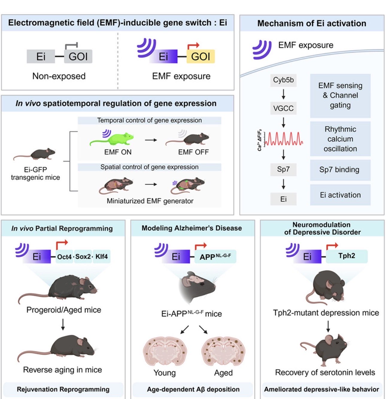 >>16959383>EMF-inducible gene switch (Ei) for precise spatiotemporal gene expression control>Cyb5b mediates EMF-specific calcium oscillations for gene switch activation>Ei gene switch enables in vivo rejuvenation by reversing aging phenotypes>Ei system models Alzheimer’s disease and restores serotonergic function in vivo