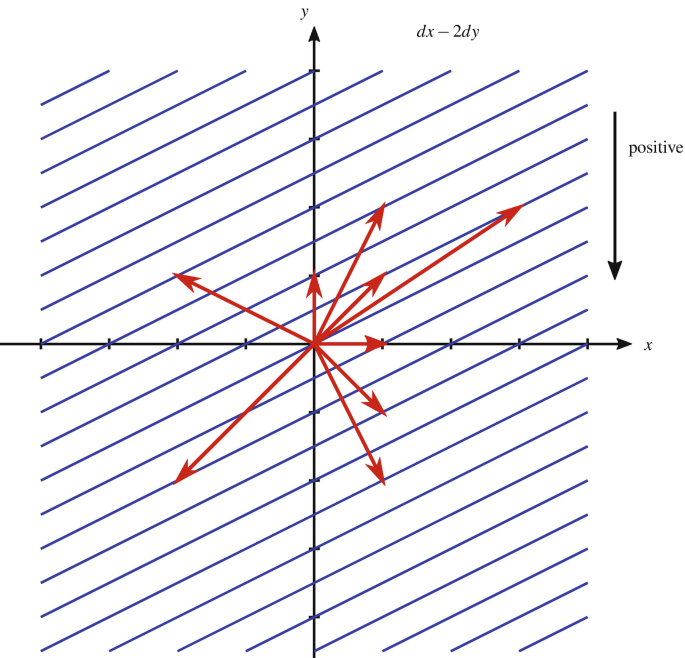>>16960691A one-form is basically a function in differential geometry that maps a vector to a scalar. You can visualize it as series of "surfaces", and the number of surfaces a vector crosses is the scalar value of the one-form and the vector.This is basically how the wave vector is visualized as well (as least how I was taught it). The distance between surfaces (wavefronts) is the wavelength and the wavefronts themselves specify a path. The wave "one-form" and the position vector together specify the phase (scalar) of a wave. The wave vector being a "vector" is basically a mismoner