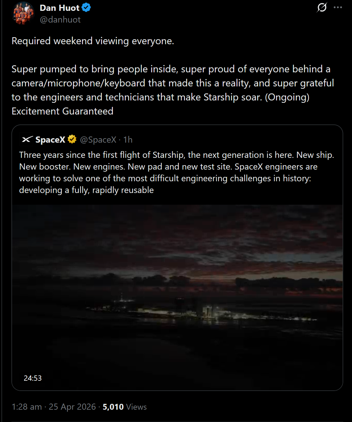Can't wait for a night launch of Starship
