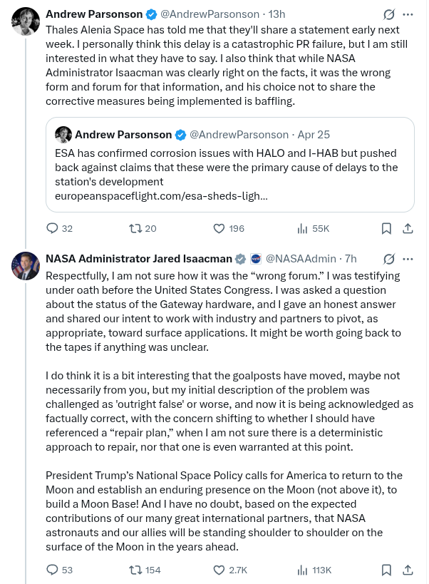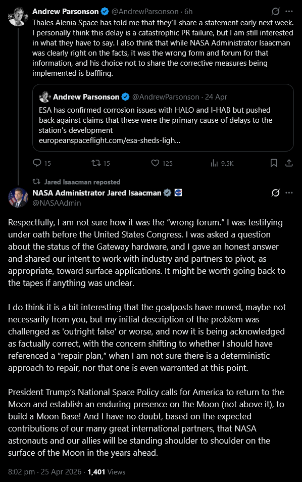 https://arstechnica.com/space/2026/04/well-this-is-embarrassing-the-lunar-gateways-primary-modules-are-corroded/>“Using NASA-approved processes, Northrop Grumman is completing repairs to HALO after a manufacturing irregularity. We expect to complete repairs by the end of the third quarter. HALO can still be repurposed for any mission, and it’s the most mature technology to support a deep space or lunar habitat.” By referring to a “manufacturing irregularity,” Northrop answered the central mystery here: how corrosion could appear in both modules. This is because a French-Italian space and defense company, Thales Alenia Space, built the primary structure of HALO for Northrop Grumman. >Thales is a powerhouse of the European space industry. It built several pressurized modules of the International Space Station, and it’s working with Axiom Space to build its commercial space station. The company also had a big piece of the Lunar Gateway in addition to HALO, developing the I-HAB module and a future communications and refueling module known as ESPRIT. Ars reached out to Thales on Wednesday evening for a comment about the corrosion issues. We received no reply until Friday morning, when a spokesperson said, “We are working on statement. We will come back to you early next week.” Northrop Grumman provided a comment within several hours of a request on Wednesday.>The European Space Agency finally offered a comment on Friday. “Preliminary findings indicate that the issue likely results from a combination of factors, including aspects of the forging process, surface treatment, and material properties. Based on the investigation and available data, the corrosion issue was understood to be technically manageable and did not constitute a showstopper for I‑HAB, which was, in any case, in better conditions than HALO from a corrosion point of view,” the spokesperson said.