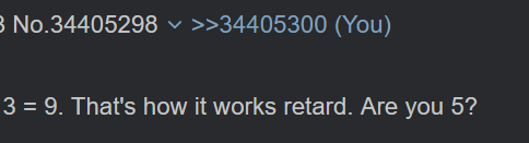 >>34405298>3 = 9Yet somehow I'm the retard!