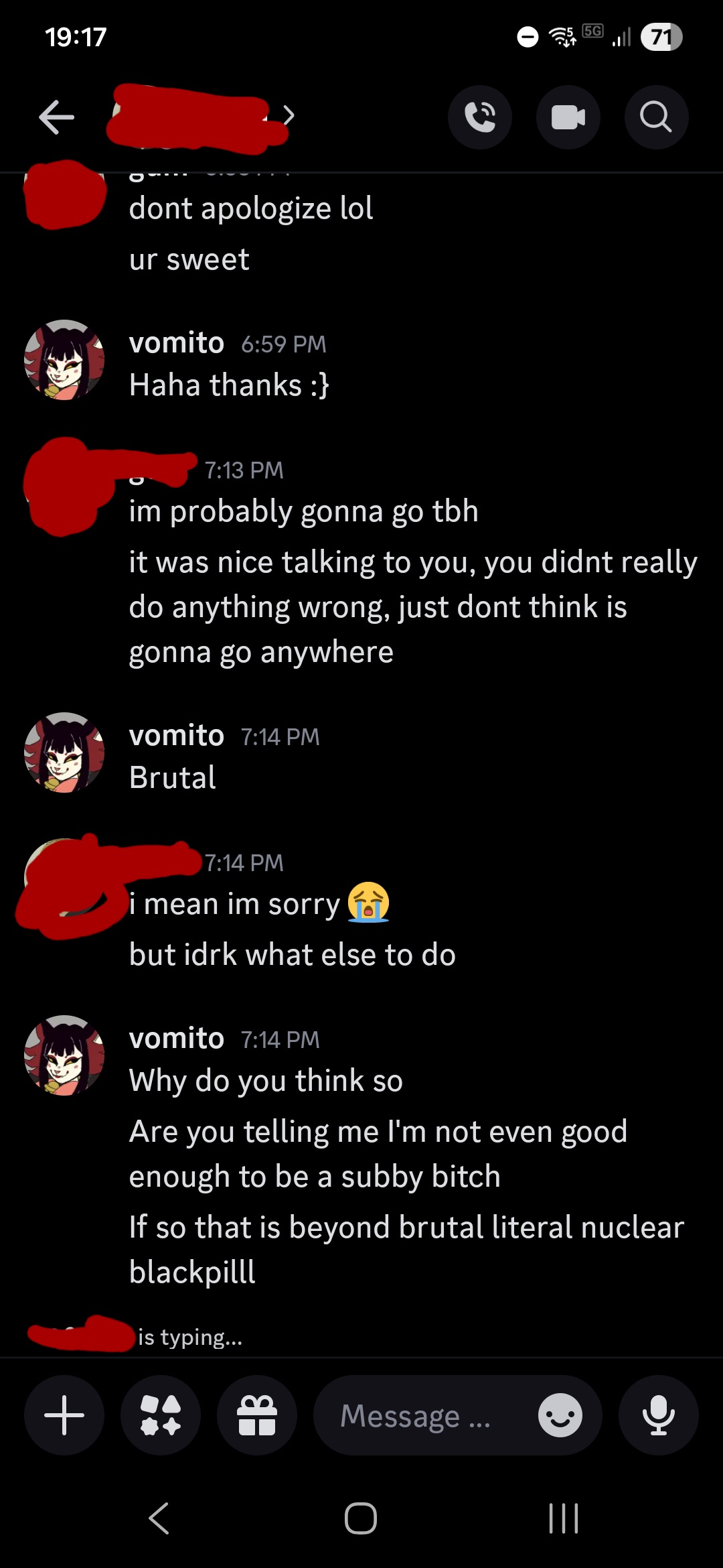 >ASL18 feminine >About meI am looking for a GIRL (cis, please) that would want to take care of me. I want to be yours and talk with you 24/7, I want to be obsessed. I have fucked up kinks so you have to accept me being fucked up gooner that will constantly want to talk about sex, but I can be wholesome beside that as well :3. Chronically online.You have to be into feminization (im very feminine, perceived as a girl, but I love this kink), accept that im very obsessive and accept that im slutty. I can dom you too sometimes. The more fucked up you are, the better! ;3>dcsoftangelgf