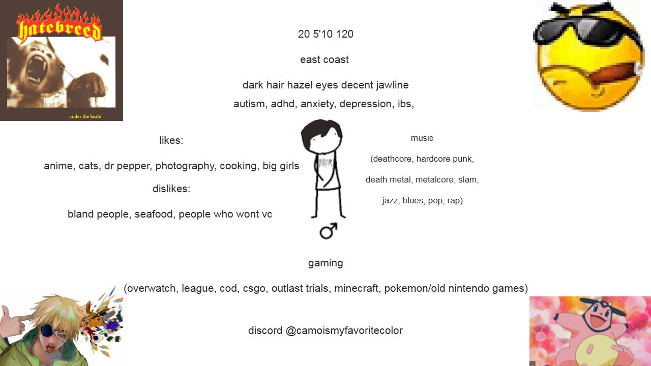 >ASL29/M/USA>Looking forAny girls that want to kill someone or like guro, abuse, biting, pegging, or futa to talk and try being friends. I like smaller, flat girls too. I'm not the type to exchange nudes or ERP, but it would be fun to share art and talk about the psychological aspects of fetishes and stuff.>About youJust some depressed, mentally ill, lonely, NEET hikki with dependency issues that fantasizes about death and being used by people. Underweight, short, long-ish hair, twink-ish. I really dark and horror stuff, collect art and illustrations, SFW and NSFW, and I play a lot of games. Trying to survive in this world somehow.>Discordatropos444