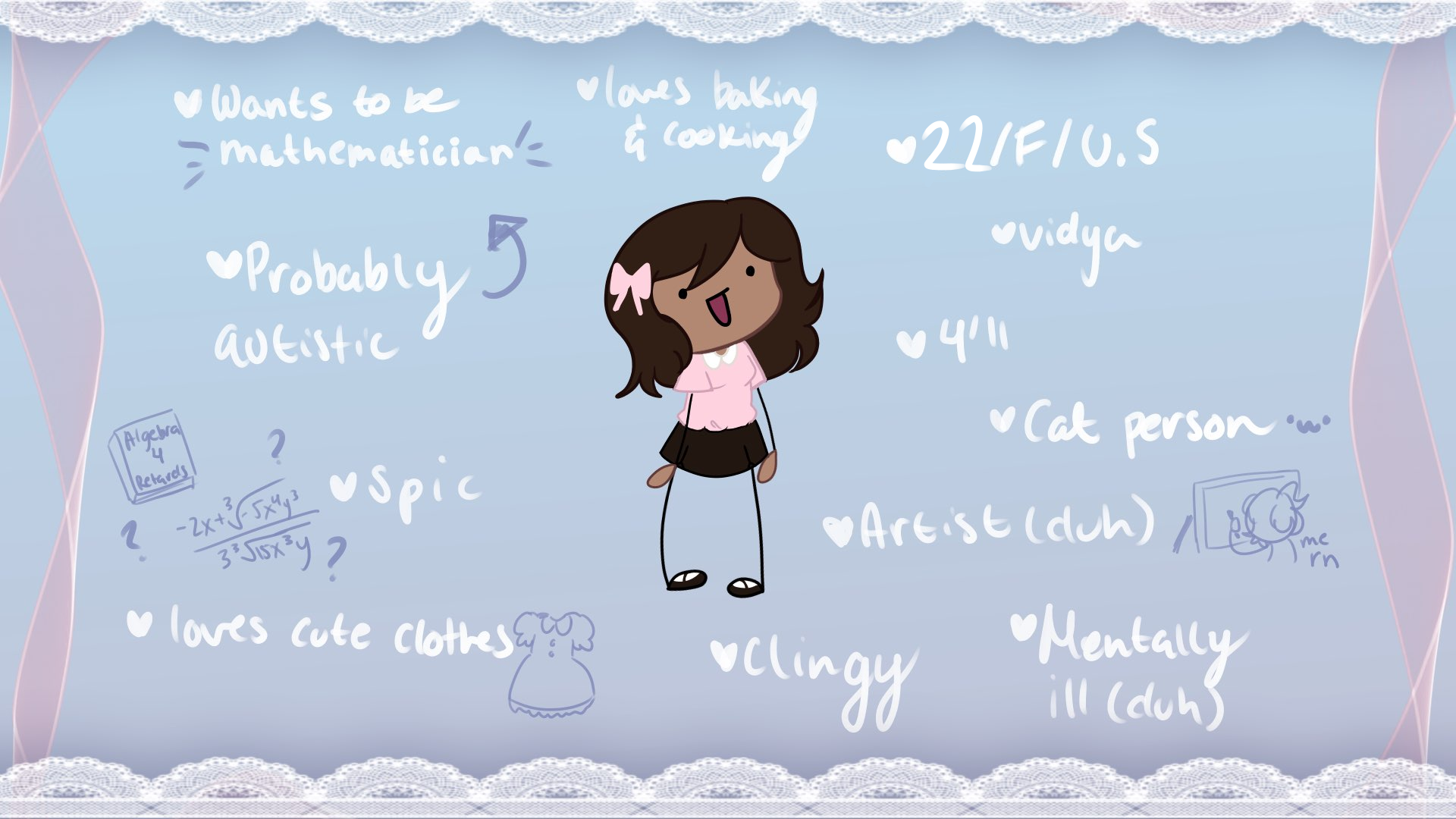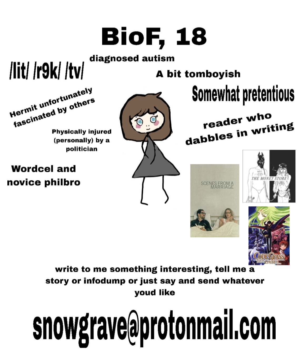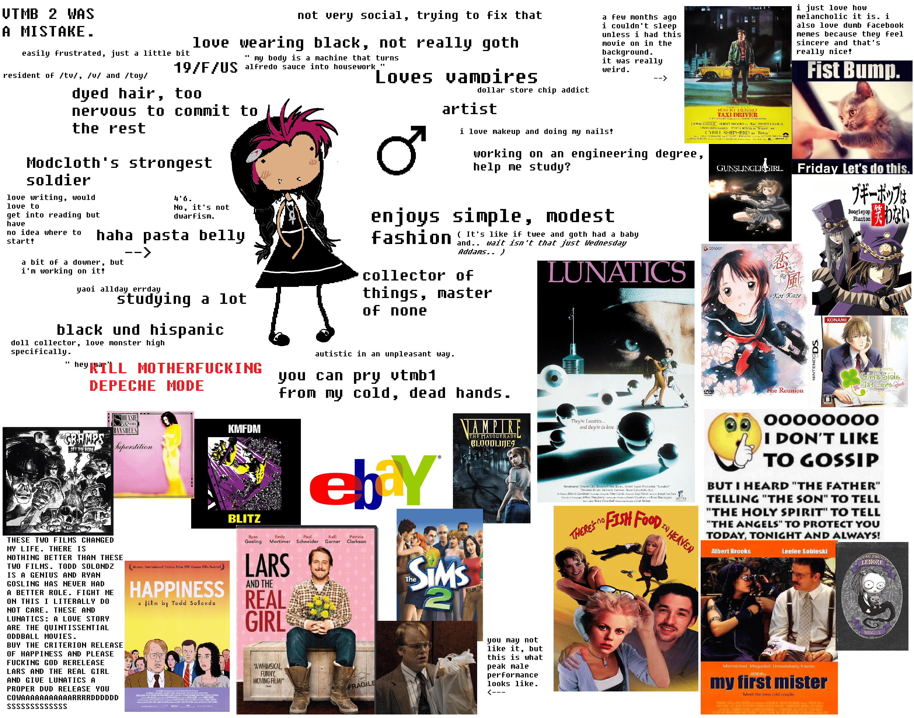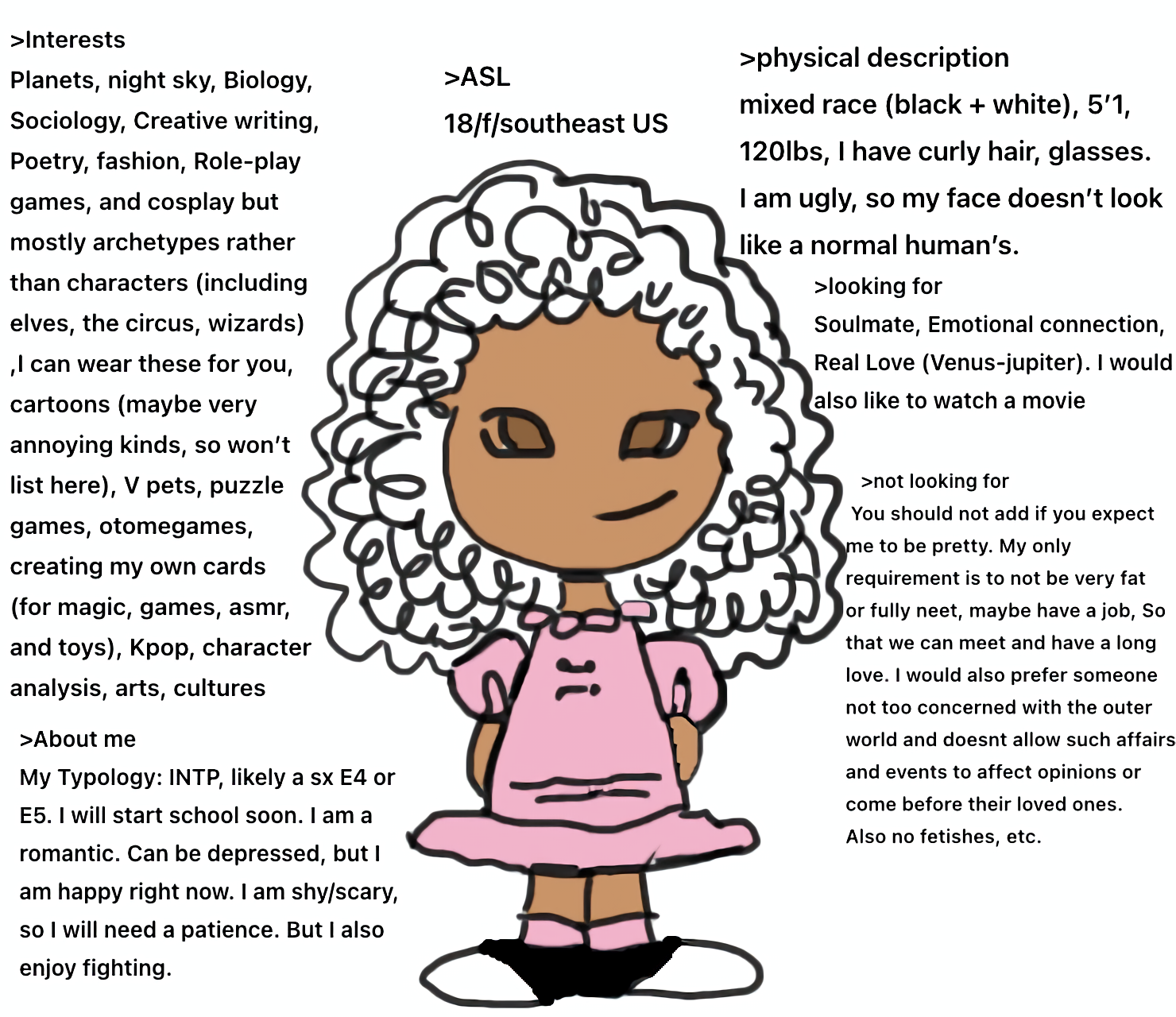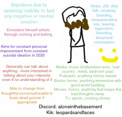 im realizing i should say some things about myself that arent just me calling myself a retard:i like music—a lot. im always listening to something, right now i really like nuclear bubble wrap but i honestly like a lot of things. i guess i like rock too and stuff.i do digital art, id really like to find someone else who also does digital art because its a big part of my life. i mean, i draw a lot, even if its isnt really impressive. yea i have a lot of interests im really embarassed to share because i feel like they make me seem uncool (not that i even really seem cool in the first place desu...)yea i hate myself a lot if u cant tell. so... be warned i guess.i just want someone who will love me despite my flaws and weirdness, and is non-judgemental and kind. i try to be as kind and sweet as i can, too.anyways. my discord is @warpeddisko —please dont just message me just to make fun of me. I know im a female on 4chan and im seeking attention by posting this. i hate myself as much as u hate me for posting this but im desperate and i have no one to to talk. not even online.ok, well, thanks for reading this far.