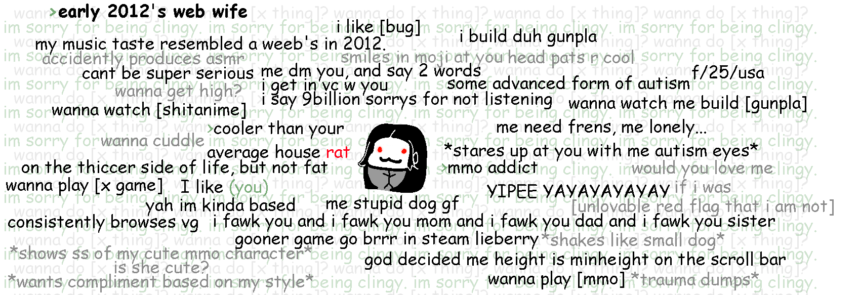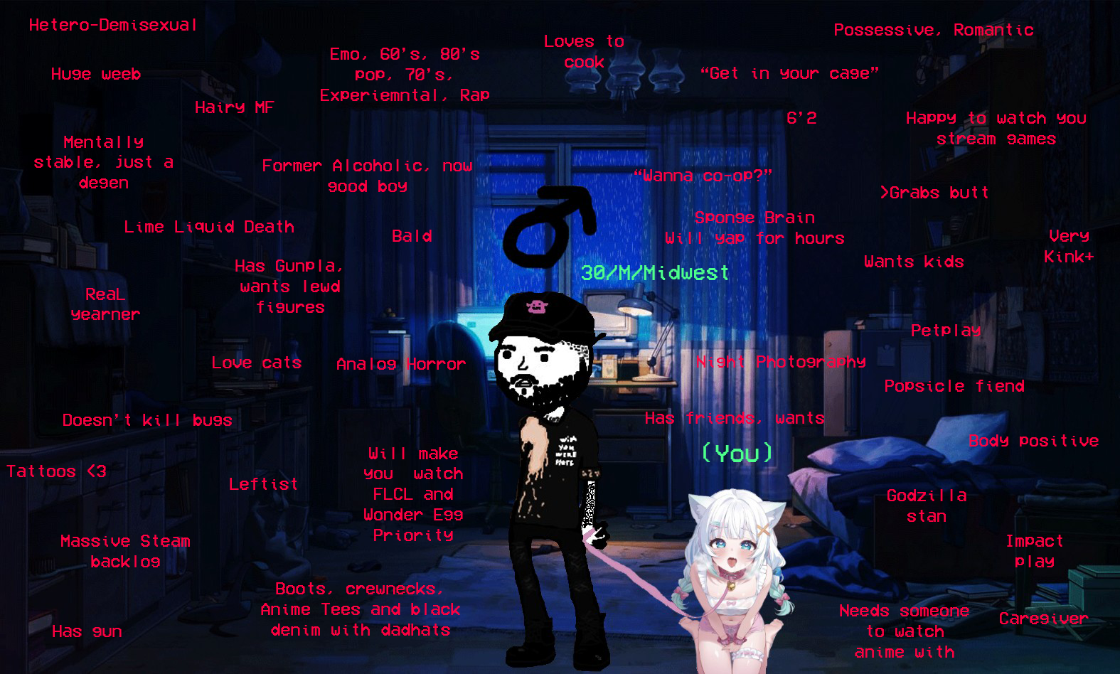 >asl30/M/TX>about meI lift when I'm not waging, and when I'm not lifting, I'm grinding vidya or watching vtubers (femcel/girlfailure tags)I can be very busy given my fluctuating schedule but I make time if we vibe.>looking forA stinky neet/nerd that spends a degenerate amount online with degenerate tastes to match.A weeb that listens to breakcore, webcore/maidcore, edm/dnb, or emo music.A girlfailure that who does nothing but play videogames ranging from fps, rhythm games, to dating sims or visual novels.Someone who wants to be taken care of like a pet, with lots of headpats.Not like a slave, even though petplay is peak, but more like an older bro x brat vibe.>NOT looking forSmall replies like "hey" or leeches thinking that I'll simp for them. Just be yourself and tell me your interests.If you haven't touched a N64/PS1, or haven't seen anime or adult swim then we won't get along.>tagdisc: retro_muscle