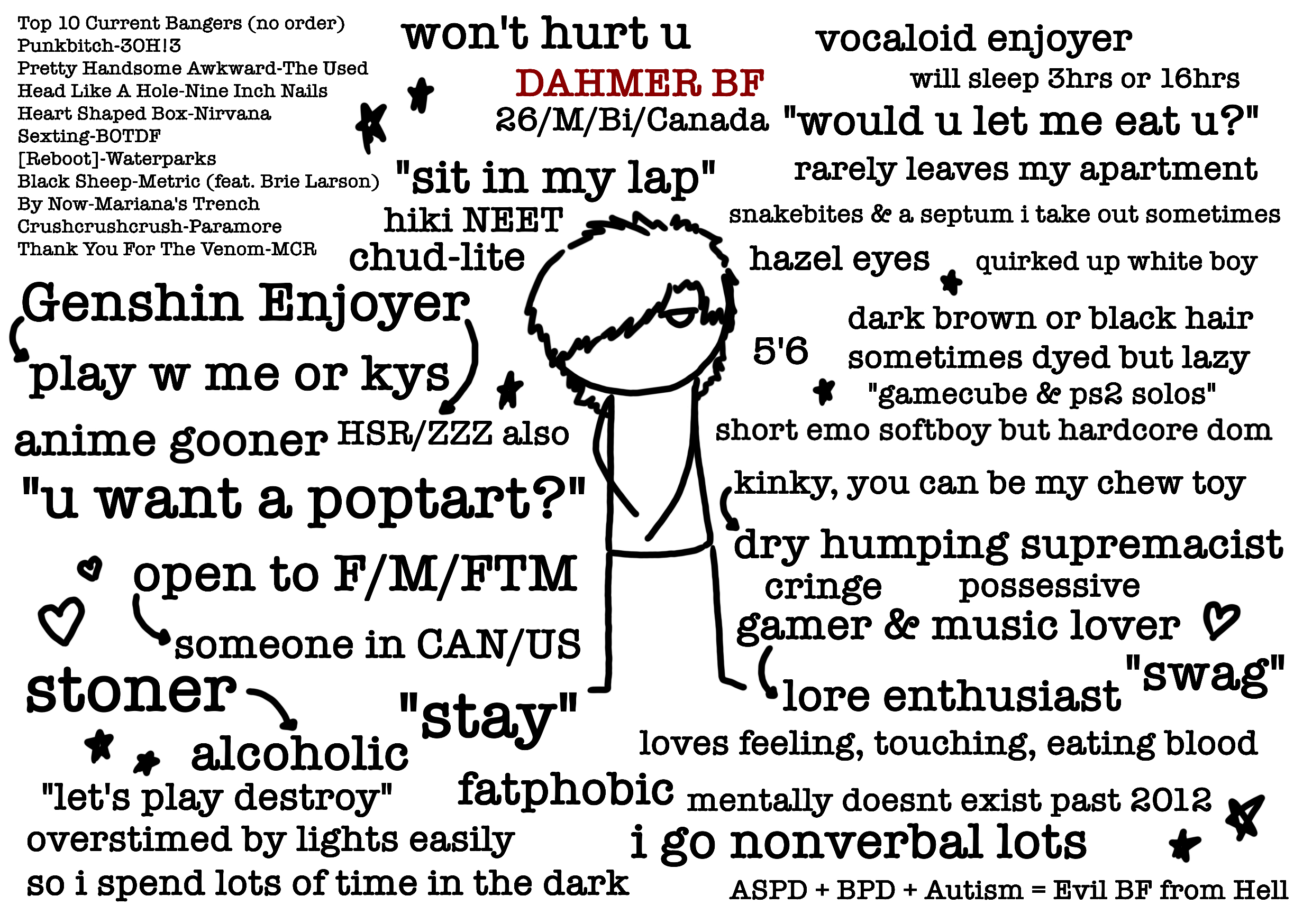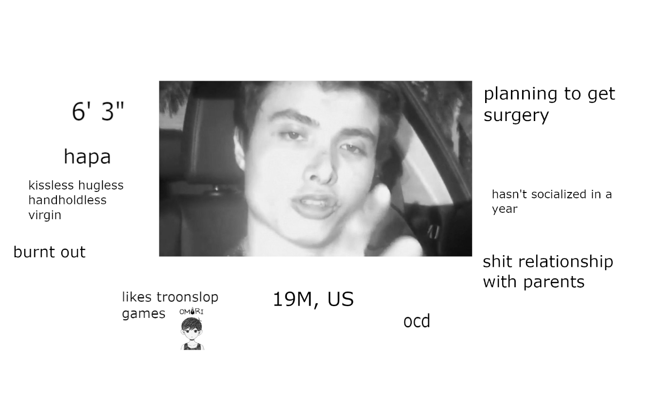 26/M/Bi/CanadaF/M/MTF onlyim a psycho loser but so is everyone here, actually read the whole fuckin picture b4 adding me cause if we have nothing in common or ur wasting my time i'll just block u. idc if ur 18-30 but ideally my age or youngerdiscord is lunae.exe