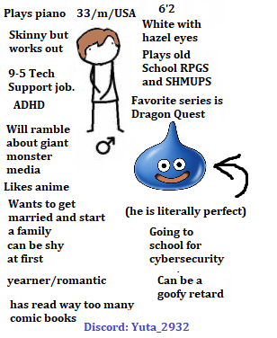 >Me:41/M/US6'3, thin, pale, blue/grey eyesempathic/loyal/curious/fairly jocularconnect more on the basis of compatible personality than shared interestsvery communicative and attentiveeducated, wide general knowledge baseenjoy reading novels, occasionally some mangalived overseas, speak a second language (jp)grew up on RPGs, but only play two games regularly nownever married/no kidsstruggle with OCD (unfortunately prefer no pets because of this)>Ideal gf:25+/bio F/USskinny/average, relatively plain/no frills appearanceconsiderate/caring/loyal/supportivefine with staying in a bit, won't get stir crazy if we're not active all the timeanywhere from quiet to talkative, both are equally fineat least somewhat intellectually curiouscan be affectionate, at least average libidoinsecurities/issues are okay, but please don't be suicidal or a poltardopen to serious LTR (LDR okay)>Discord: varandra