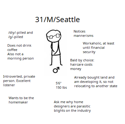 After a year of dating apps, I'm wondering if I might be too retarded to meet people like a normal person. Posting, but keeping my expectations low because this is still 4chan.me:>31/M/Seattle>5'6" white, brown hair/eyes>Keeping a shaved head because I am not giving someone $15 to run a buzzer over my skull>Get nervous easily. It's me, not you. Keep prodding me.>Financially educated, knowledgeable in construction and technology, enjoy vidya>Introverted>No baggage, no mental illness. Strangely well-adjusted for posting on /soc/>Want to start a familyI bought and am developing land I intend to die on. I might be persuaded to relocate, but you need to have very strong arguments.you, ideally:>28+/bio female>Big plus for SEA or Latina>Have some kind of career direction>Interrogative nature, always asking about the deeper "why" (to a point)>Willing to invade my personal space, even if I look grumpy and uninvitingWe need to like each other before we can discuss dating, regardless of distance. But preferably, you're in the Seattle area and we can just get some shitty coffee or something and have a bunch of near misses in traffic.