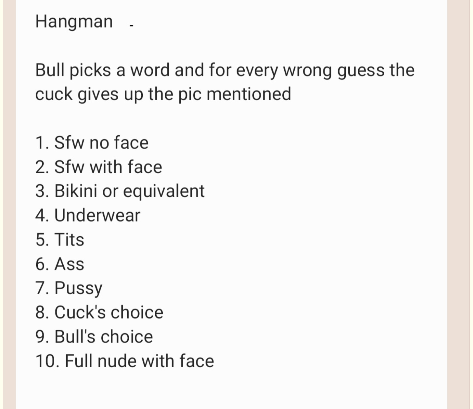 Horny bull here looking for Cucks or anyone into the following:1. do you enjoy sharing your gf/wife/ex's with strangers?2. Do you enjoy sharing you sisters/cousins/daughters/other family members with strangers?3. have you ever seen someone naked that you shouldn't have? was it by accident or on purpose?4. Do you have any pics/vids of others that you shouldn't? Maybe you promised you deleted or maybe you took them in secret?5. Do you like to share your creep/voyeur/hidden cam pics/vids?6. Do you like the thought of a stranger controlling you and your girl? I can do that.7. Do you like the idea of a stranger controlling your girl through you without her knowing?What I can do for you:1. I will Rate your girls2. I can help spread or keep 100% confidential (between us only)3. I can share your girl with others that I know and show you their reactions.4. I can WWYD if I really like your girl.5. If she makes me cum, I'll cum trib her.6. I can put you girl as my phone background or up on my 70" tv.7. I can get into snaps8. I am very dom. if you want to be controlled and punished for pics and vids of your girls9. I will send girls their own nudes and try to get more.10. i can put your girl as my kik profile pic11. i can put your girl as my phone background12.Share what you are into and I'll see if I can accomodate13. we can play a game of hangman for your girl rules in picPlease reply with what your into and a pic to start or what you are into to startkik and discordannonmyst5436