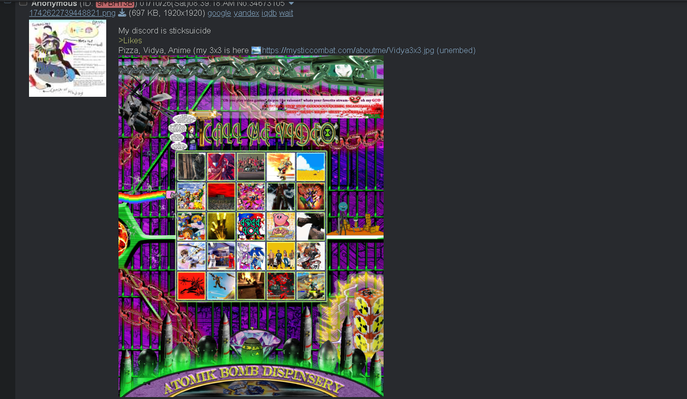 My discord is sticksuicide>LikesPizza, Vidya, Anime (my 3x3 is here https://mysticcombat.com/aboutme/Vidya3x3.jpg ), combat, drawing, cartoons, Metal, Nukes, Knifes and Katanas, Children, Planet vegeta, Colonization, Computers, Armpits, Money,The purple chaos emerald (brother is sealed inside),Chains, Gears, Natural Selection>DislikesTrannies, Lotion,Mean People,Frost demons, Jews, Niggerz, Women, Hypnosis, Vidya (post 2015), Ketchup, All Reploids, Mobile phones, Globalzation, Women, Polidicks, People who witness rape and say "ew"