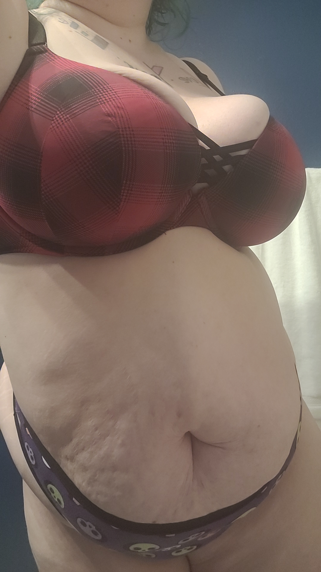 >>34694519You dyed your hair a nice shade of blue. I love your body. Nice tits and belly, I'd be playing with them for a while. The best part is that you're wearing your panties over your garter belt. Makes it easier to fuck you. So sexy.