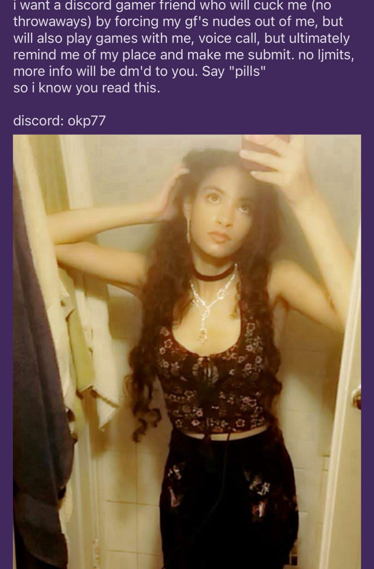 I don't trade nudes, I won't answer too fast, sometimes not even in the same day. I don't want to meet any misogynists you're annoying. I'm not a virgin. I don't want to talk to anyone who doesn't fit into anything in my looking for thingy.