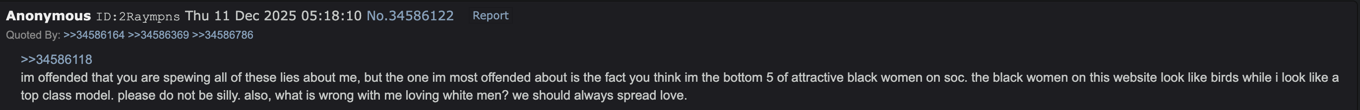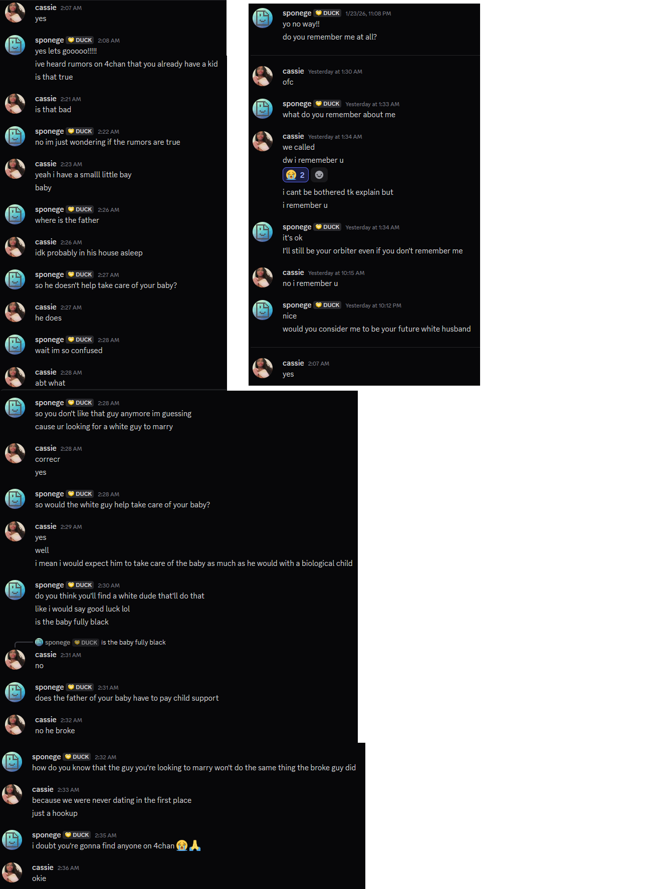 This thread is entertaining as shit. Between Cassie herself and her delulu antics, her desperate orbiters, the random white skellingtons posting dick, and now jealous femanons seething. It’s like a reality show. I can’t believe you people are real.