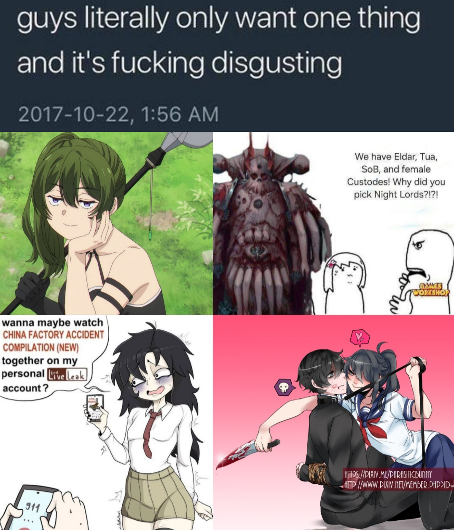 >ASL26m Canada>personalityHopeless, fall hard for those that bring deep loyalty and passion. blue collar and work hard building a future for someone i haven't met yet, ill listen to your passions for hours a happy man >interestsFps games, all kinds of music(show me your music!) random stuff, >looking forsomeone with a head on their shoulders, don't care your gender i care about the person. i love the clingy and people that speak their minds >not looking foridk honestly >contactmuerte9902