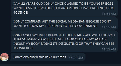 still very dubious as to her actual age too, she frequently talks about homework and school and the other students. i dont know what sort of schooling she is in of course, whenever someone asks about it the question is completely ignored as far as ive seen. if she is underage still then id def think the authorities need to step in and investigate child abuse. for reference the adult age in aus is 18, ive seen her say that shes anything from 15 to 32 in the last few months.