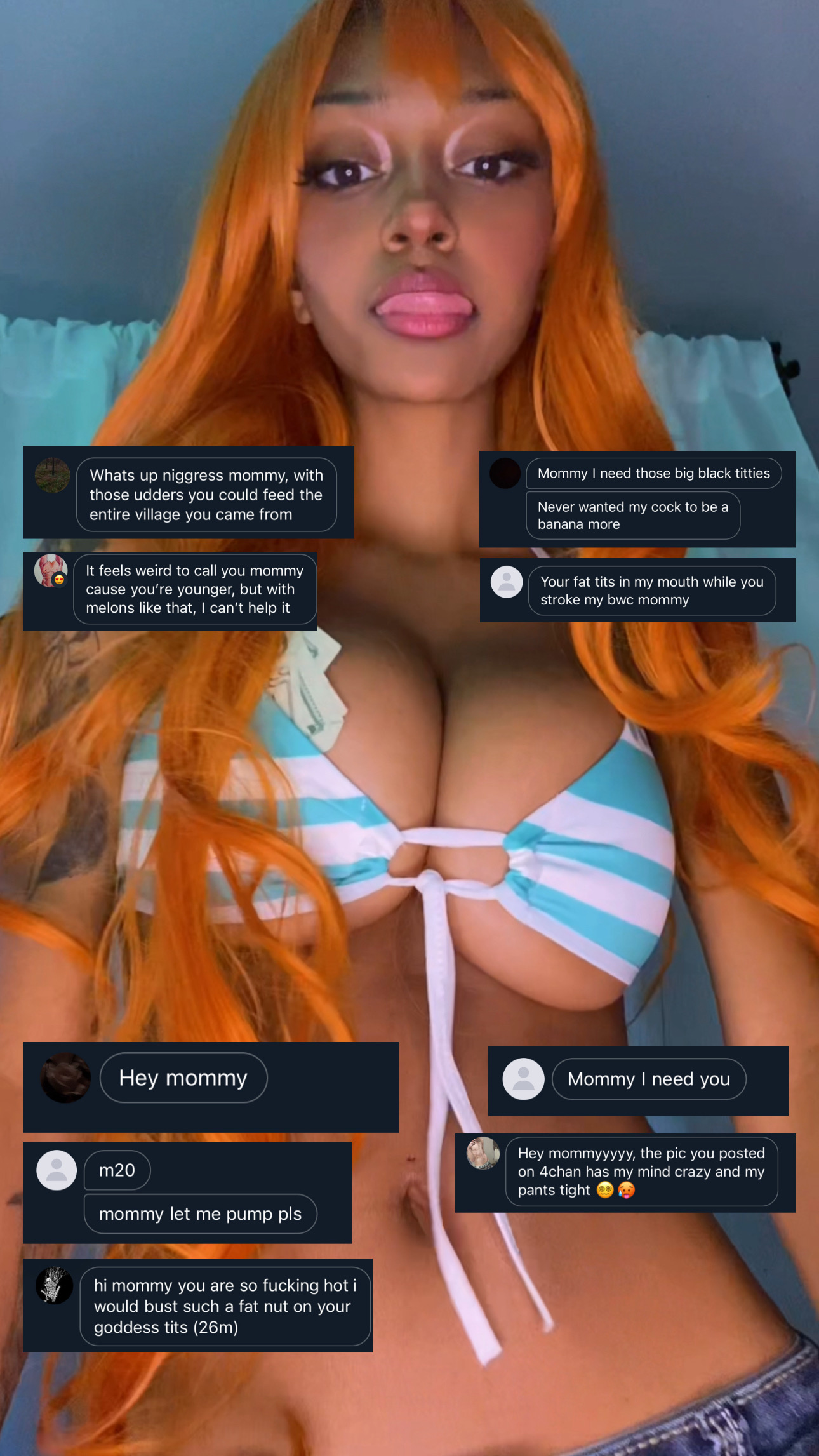wanting to pass the time, sooooo ask me whatever, dm me, rp w me, idc.posting on here on my 3rd account : D@dalisagain on kikall of my genetics went upstairs btw LMAO. need cock between my titmeat, milkbags, whatever u wanna call them.also i’m aware 4chan’s racist and blaah blaah i don’t mind. i’m into raceplay. and free use. and maybe snuff.. maybe. i don’t discriminate on who gets to see my tits usually. i also MAAAY or may not have a video of my dad (he sent it to me) jerking off to me. no, we dont have a good relationshippromise ill try and respond. i swear.my erome!!https://www.erome.com/a/icFMzhdYcall me mommy for an instant response