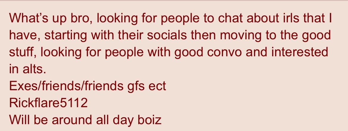 >asl18 F>aboutLast time I posted I met a really fun guy that went by spooky. But he stopped replying to me now so I'm trying to find someone new to chat with.>intoI'm looking for a long term daily chat friend on discord. Both sfw and nsfw are fine with me.>not intoAs long as you're not overweight you're prob fine to reply to me. Just include your asl, weight and some basic info about you and I'll add you. I'm not a seller or whatever, I'm not gonna waste your time.>discordI don't accept friend requests so you gotta include yours in your reply so I can add you.