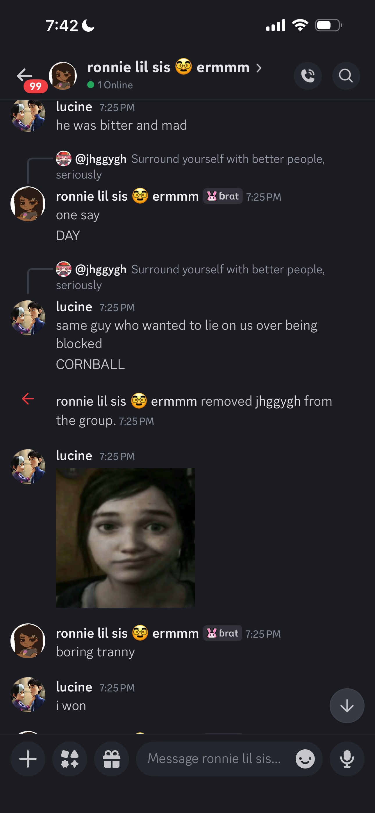>>34875305>>34875375Cope and seethe, you're a cunt but your sister is chill. She's gonna leave your hateful ass when she can.