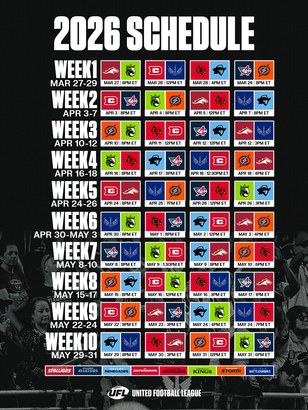 >WhatA general dedicated to the discussion springtime-ish gridiron football leagues>WhoUFL(U.S), CFL(CAN), X-League(JPN), ELF(EU) and various other league that fluctuate in being alive>News>United Football LeagueSchedule Announced - Tuesday games are realMichigan Panthers, Houston Roughnecks, Memphis Showboats, San Antonio Brahmas are dead.Columbus Aviators, Houston Gamblers, Louisville Kings, and Orlando Storm have taken their spots respectively.Comment too long. Click here to view the full text.