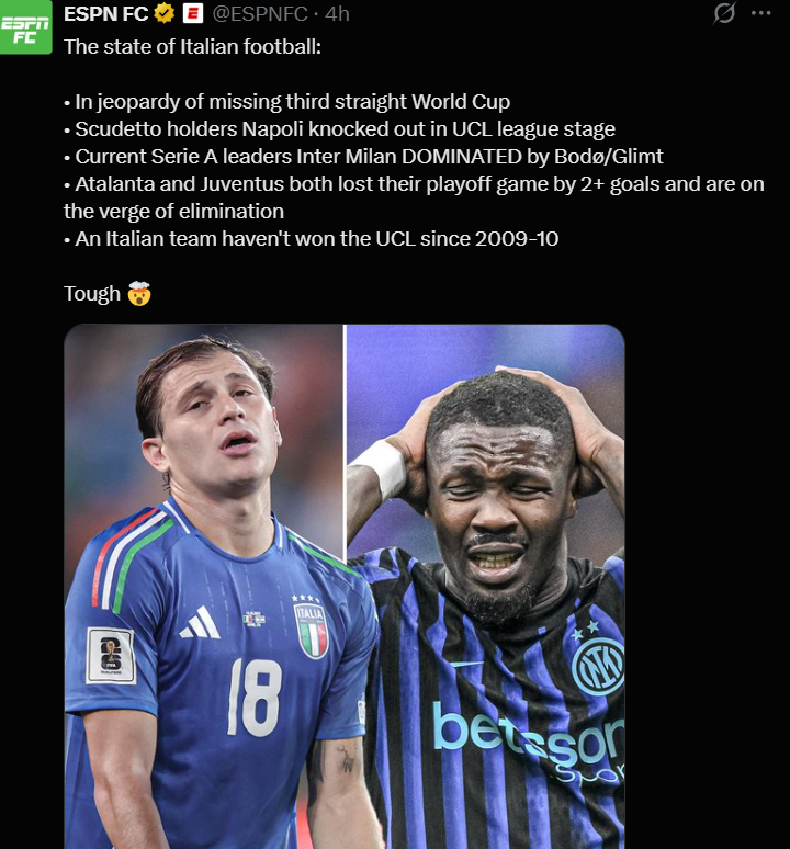 CHAMPIONS LEAGUE ROUND OF 32>Tuesday 24th February 202621:00 Inter - Bodø/Glimt (1-3)>Wednesday 25th February 202618:45 Atalanta - Dortmund (0-2)21:00 Juventus - Galatasary (2-5)EUROPA LEAGUE ROUND OF 32>Thursday 26th February 202621:00 Bologna - Brann (1-0)COMFY LEAGUE ROUND OF 32>Thursday 26th February 202618:45 Fiorentina - Jagiellonia Bialystok (3-0)Comment too long. Click here to view the full text.