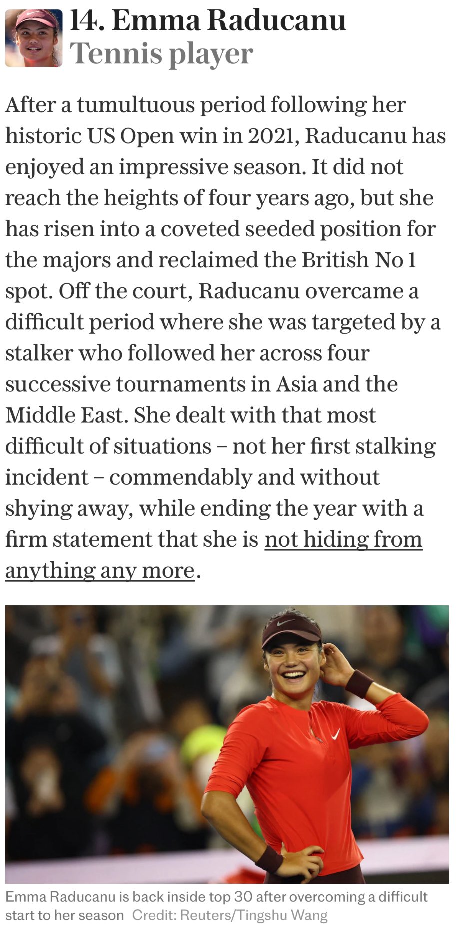 Emma is 14th place on Daily Telegraph’s ‘’Fifty most influential women in sport 2025’ list, published yesterday