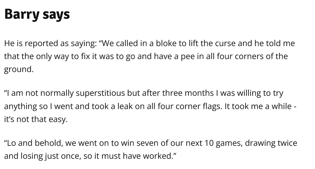 Birmingham City were once under a gypsy curse that was only lifted after Barry Fry did a wee at each corner flag.