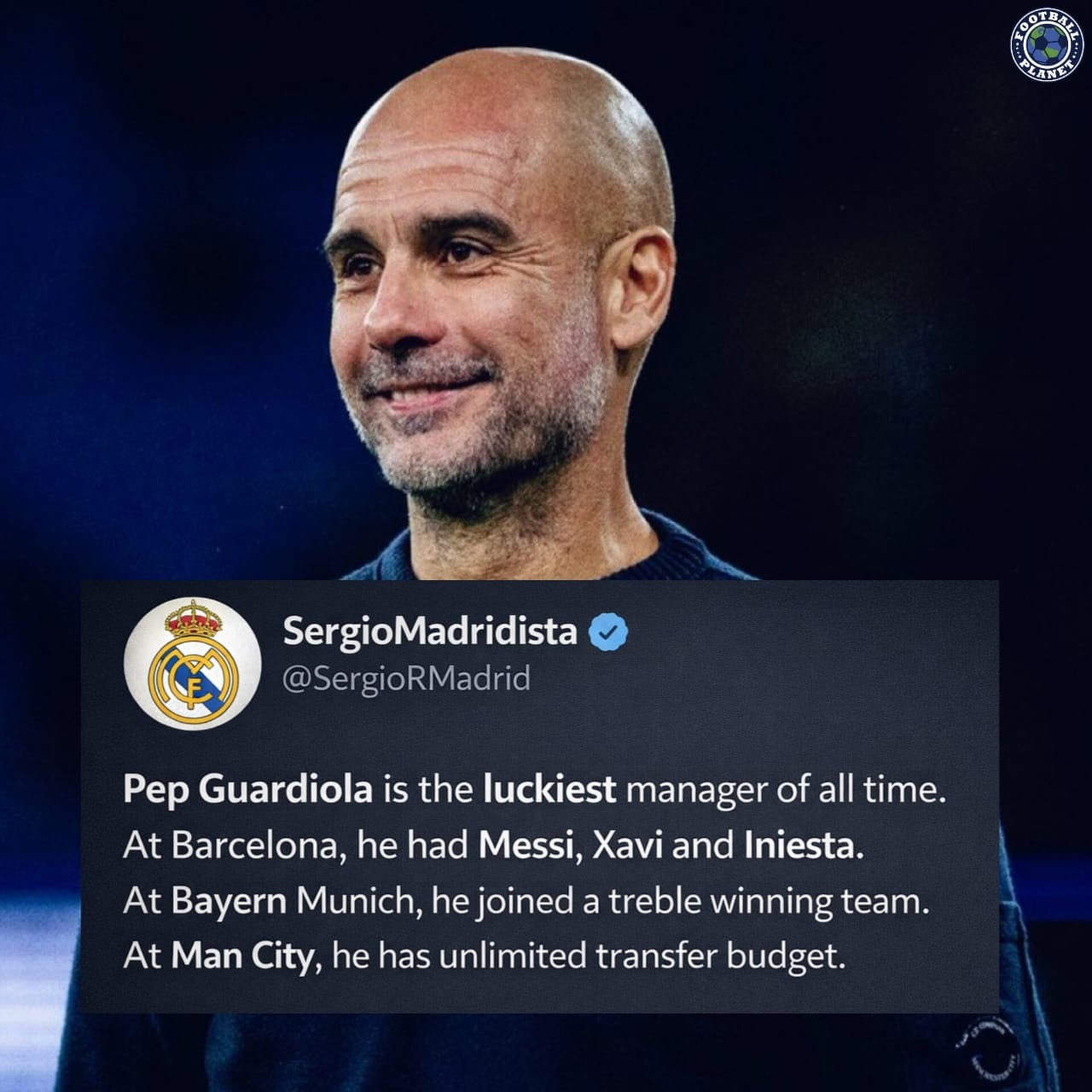 >Pep Guardiola is the baldest manager of all time.>At Barcelona, he had no hair.>At Bayern Munich, he had no hair.>At Man City, he has no hair.