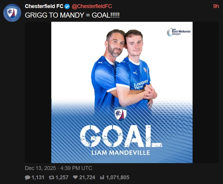 >>152481747I mean it's smart when you think about it. Like who the fuck even knows who Chesterfield FC is. Yet>21k likes, 1M views