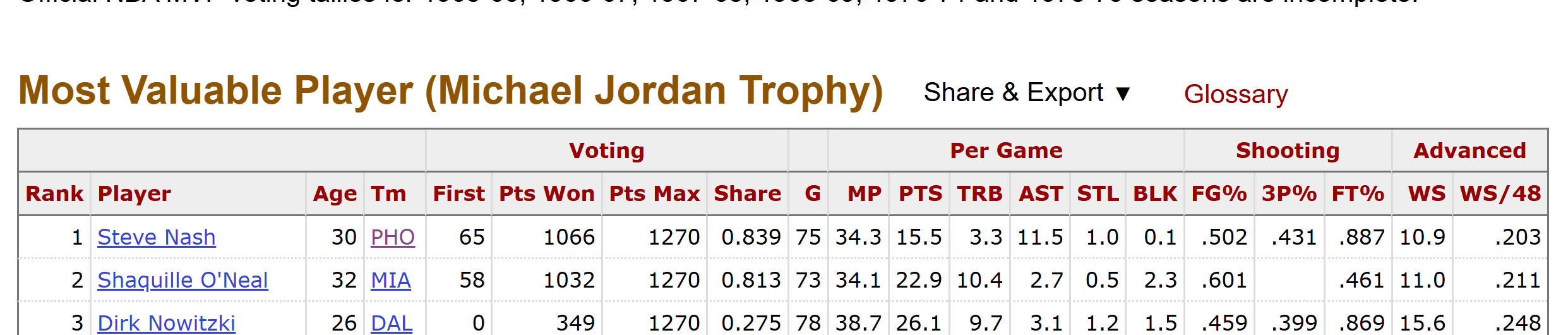 >>152682808If anyone else should've won it that year it should've been Dirk. 20/10 as the second best player on your team is not MVP worthy. I don't see how the voting was even that close.But this also goes back to the argument of whether it goes to the best player in the league or most valuable player to their team. Really there should just be two fucking awards and save the controversy. You can give Kobe best player in 2006 and Nash MVP, same thing for him and LeBron in 2009. Or at least do like the NFL does and have an offensive player of the year.