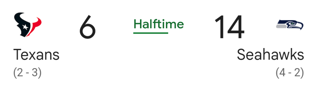 prev >>151505004HOU 6 - SEA 14The Texies have no offense, but can they manage to make this game interesting in the 2nd half?