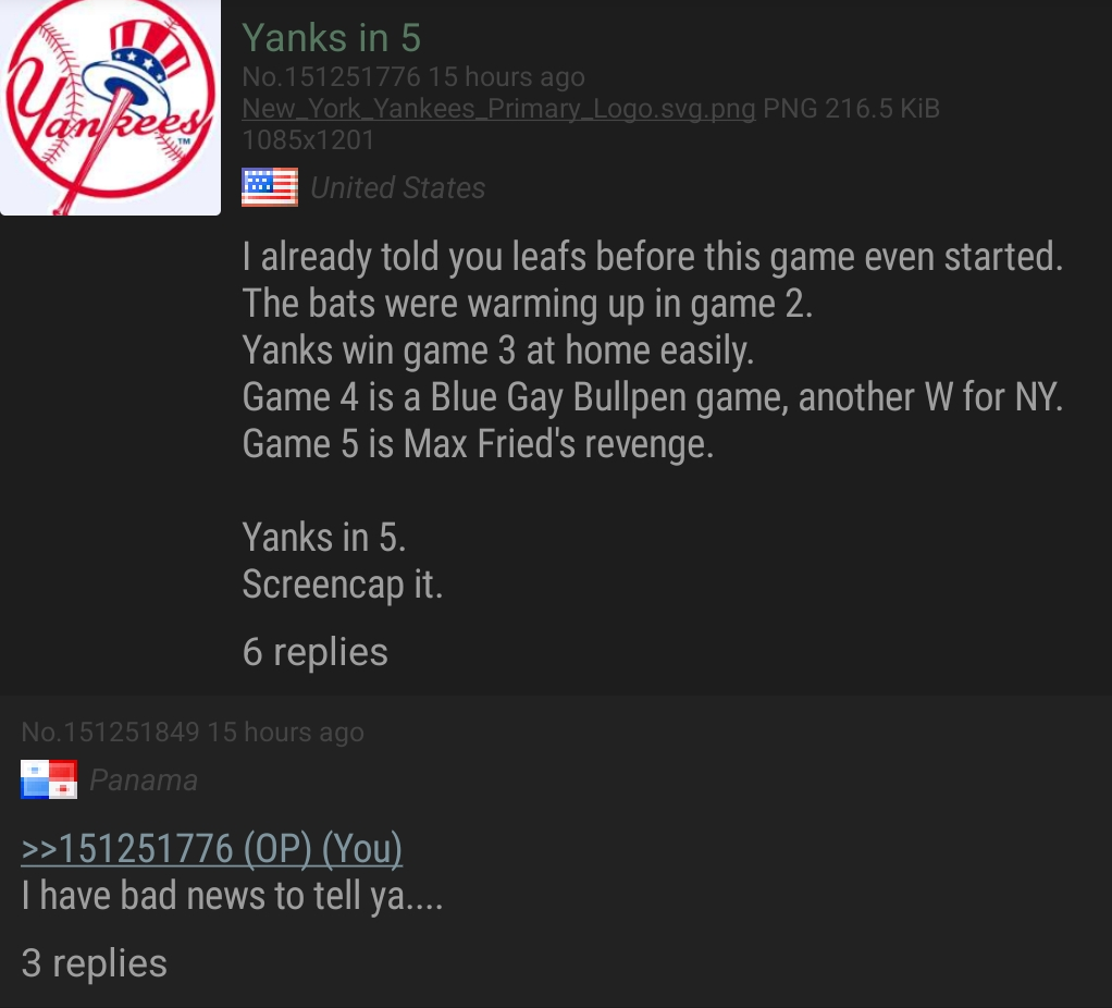 >>151257273Why yes I will take credit for being right.Yanks in 5.
