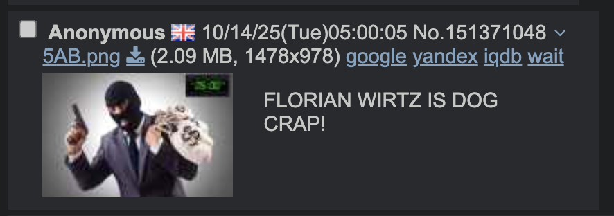 >>151373133the 5am bandit has seemingly struck again, this time with a devastating hit and run attack on once-in-a-century talent Florian Wirtz. we as the entire /epl/ community must come together to condemn this.