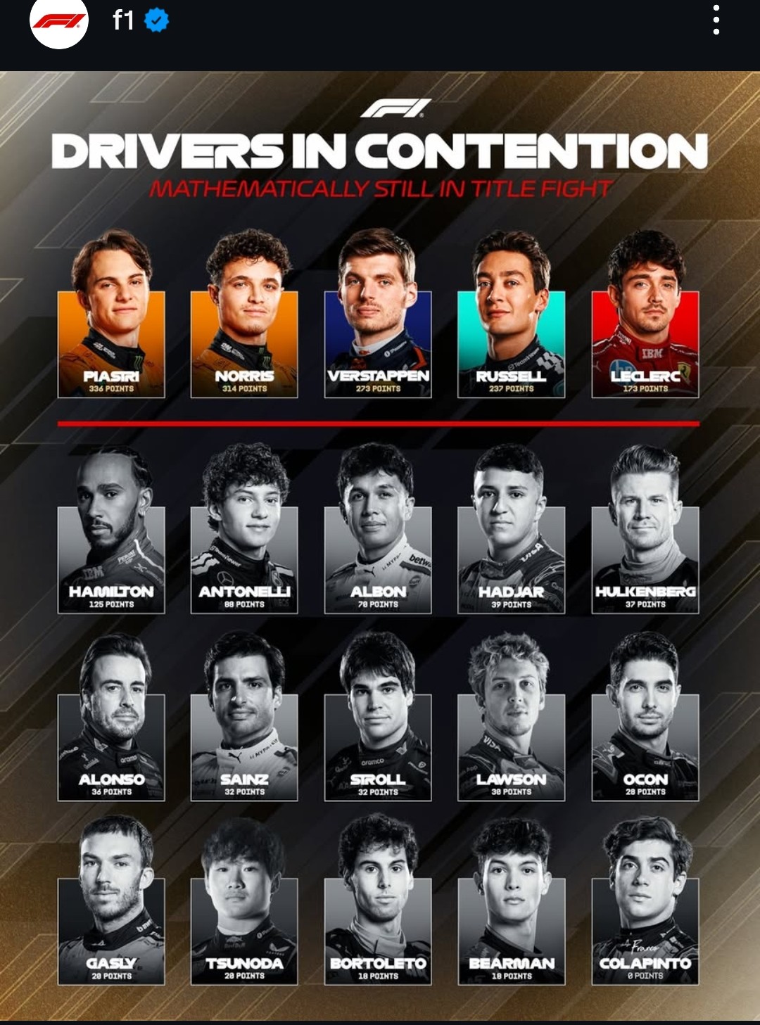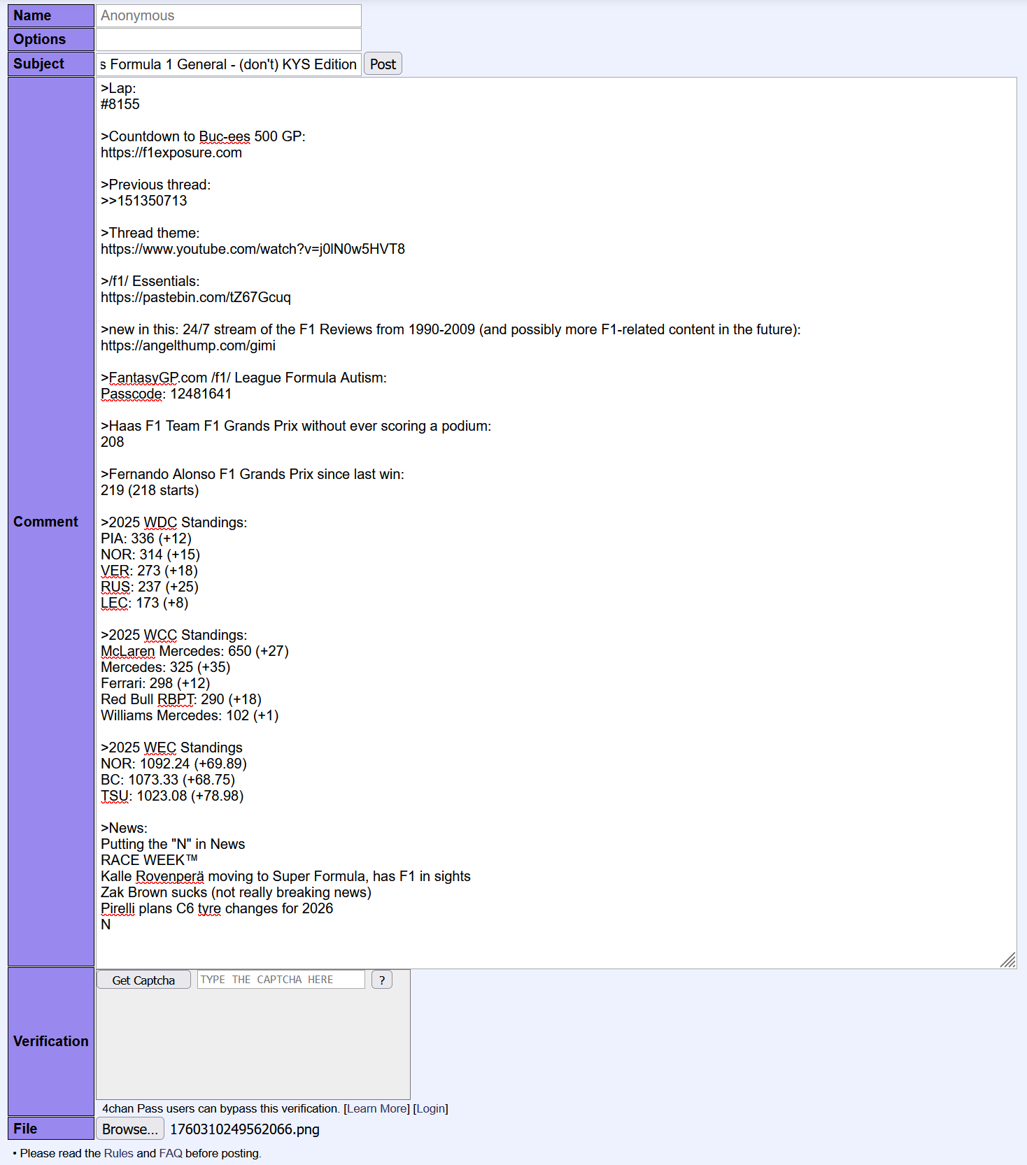>Lap:#8155>Countdown to Buc-ees 500 GP:https://f1exposure.com>Previous thread:>>151350713>/f1/ Essentials:https://pastebin.com/tZ67Gcuq>new in the essentials: 24/7 stream of the F1 Reviews from 1990-2009 (and possibly more F1-related content in the future):https://angelthump.com/gimi>FantasyGP.com /f1/ League Formula Autism:Passcode: 12481641>Haas F1 Team F1 Grands Prix without ever scoring a podium:208>Fernando Alonso F1 Grands Prix since last win:219 (218 starts)>2025 WDC Standings:PIA: 336 (+12)NOR: 314 (+15)VER: 273 (+18)RUS: 237 (+25)LEC: 173 (+8)>2025 WCC Standings:McLaren Mercedes: 650 (+27)Mercedes: 325 (+35)Ferrari: 298 (+12)Red Bull RBPT: 290 (+18)Williams Mercedes: 102 (+1)>2025 WEC StandingsNOR: 1092.24 (+69.89)BC: 1073.33 (+68.75)TSU: 1023.08 (+78.98)>News:F1® RACE WEEK™Basically: Crisis at FerrariAlso the car company lost all gained share value from the last 2 yearsMick tested a champ carLuke Browning will be in FP1 at the Mexico City GPS*sie W*llf is still a huge whoreGeorge still doesn't actually have a contract for next year