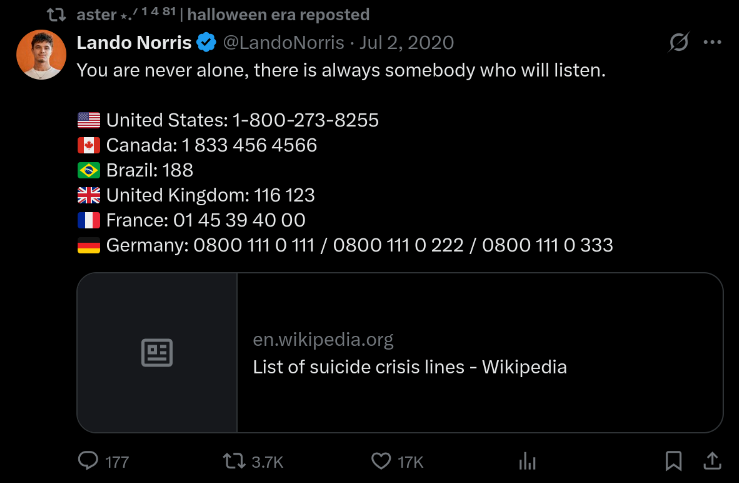 >>151373631What good does a Brazilian suicide hotline do when you don't speak their language? Does Norris speak their language?