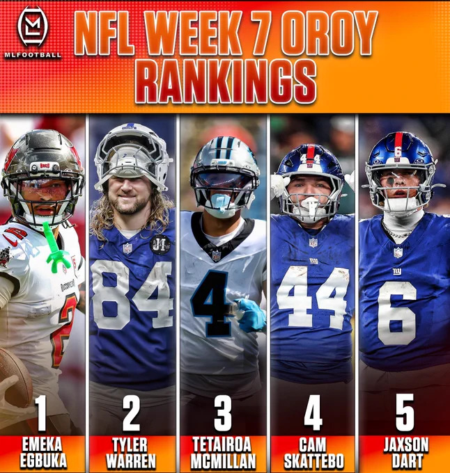Going into week 71. Mahomes (unfortunately)2. Mayfield3. Darnold4. Rodgers5. Stafford6. T-Law7. Maye8. Herbert9. Penix10. JJ McI'd have added Josh but not only did the Bills lose to the Falcons, the Bills are also going into their Bye week.