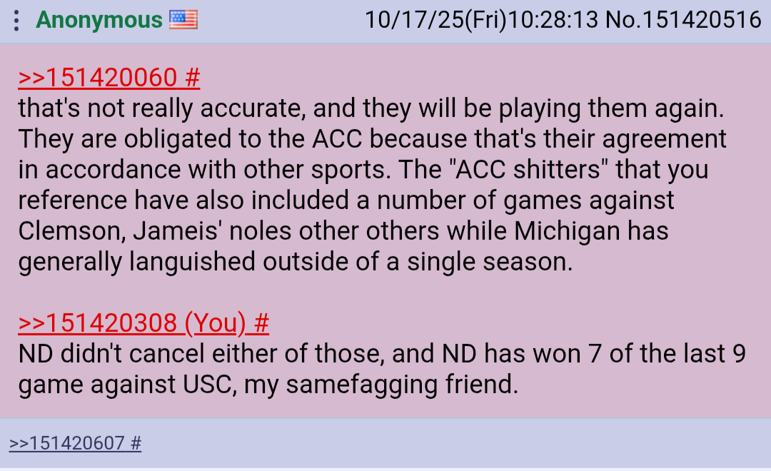>>151422688ok maybe you're the rare one but 90% of anons on /cfb/ are here because they live in the south and have an inferiority complex to yankees and/or are bad at the NFL, it's basically a refugee general for southerners