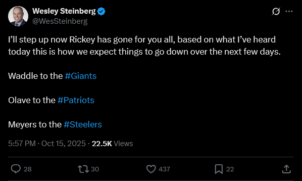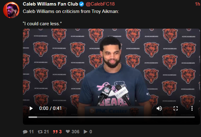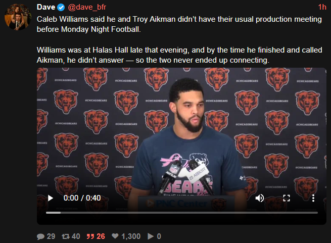 >[Hoge] Caleb Williams said he and Troy Aikman did not have their usual broadcast production meeting before MNF. Williams was at Halas Hall late the night they were supposed to connect. He called Aikman when he was done, but he didn't pick up. They ended up not connecting.