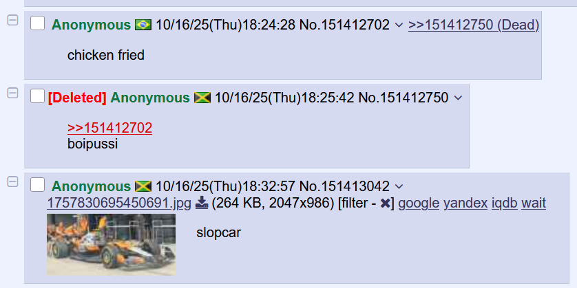 >>151408043>Not really, they can still be a flop in P20 even if Max is P19.Which demonstrates that the car isn't capable of achieving better, which is not a driver flop. If it's that abysmal then Hadjar could be retiring every single session including practice and still justify his seat.