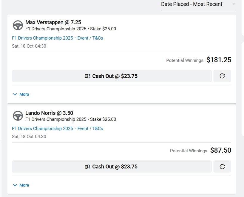 >Lap:#8157>Countdown to Buc-ees 500 GP:https://f1exposure.com>Previous thread:>>151393626>/f1/ Essentials:https://pastebin.com/tZ67Gcuq >new in the essentials: 24/7 stream of the F1 Reviews from 1990-2009 (and possibly more F1-related content in the future):https://angelthump.com/gimi>FantasyGP.com /f1/ League Formula Autism:Passcode: 12481641>Haas F1 Team F1 Grands Prix without ever scoring a podium:208>Fernando Alonso F1 Grands Prix since last win:219 (218 starts)>2025 WDC Standings:PIA: 336 (+12)NOR: 314 (+15)VER: 273 (+18)RUS: 237 (+25)LEC: 173 (+8)>2025 WCC Standings:McLaren Mercedes: 650 (+27)Mercedes: 325 (+35)Ferrari: 298 (+12)Red Bull RBPT: 290 (+18)Williams Mercedes: 102 (+1)>2025 WEC StandingsNOR: 1092.24 (+69.89)HAM: 1073.33 (+68.75)TSU: 1023.08 (+78.98)>News:US GP second F1 race in row to be 'heat hazard'Pressure “getting to” Oscar Piastri in 2025 F1 title fight, says Juan Pablo MontoyaMick Schumacher ‘better than three current F1 drivers’ - Ralf SchumacherBrown laughs off "clearly ludicrous" Palou court claims amid trialHelmut Marko hints ex-McLaren F1 junior Alex Dunne isn’t an option for Red BullLewis Hamilton warned it could take “four to five years” to fully adapt at Ferrari by Hakkinen'Mercedes deals end Verstappen speculation - for now' - BensonGeorge Russell opens up about his childhood “anger and anxiety”Carlos Sainz: Singapore GP broadcast comments "blown out of proportion"FIA revises rules to help manufacturers who fall “significantly behind” in 2026