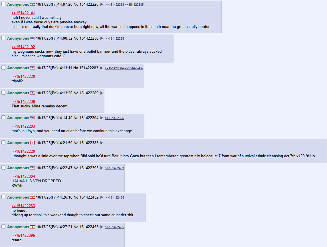 >>151422849listenI'm gonna be honest with youI seriously don't know how to use a vpn on 4chanI have one on my PC but not my phone (where I post from exclusively)last time I tried to post from my PC with the vpn enabled I got an automatic 3 day.sorry I'm not a techfag or whatever I'm sure this is common knowledge amongst basement weebs but I'm just a good old fashioned rustbelt chud who likes to banter about hockey and I just happen to be working overseas at the moment
