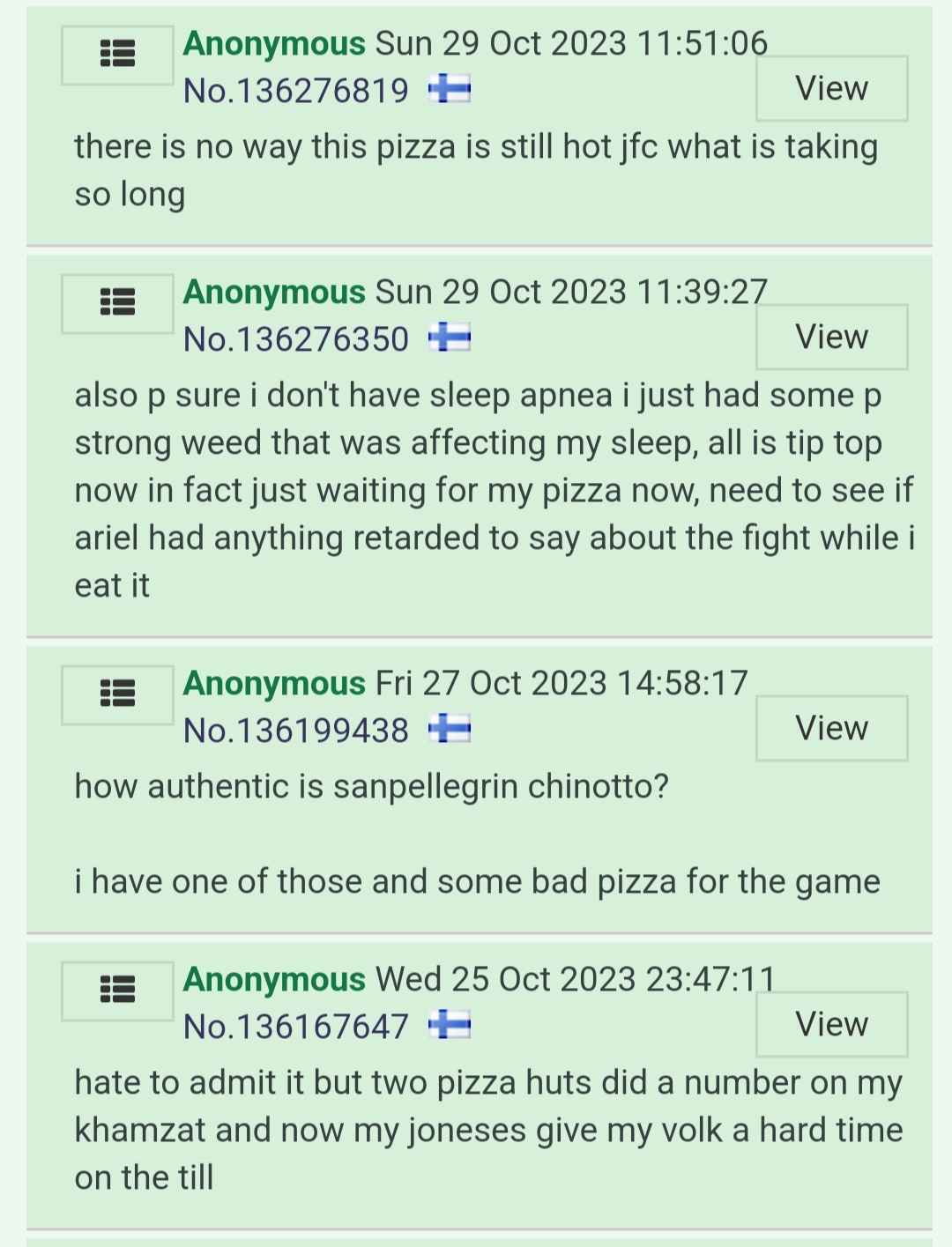 In October of 2023, a finnish man ordered two pizzas. What he could not comprehend in that moment was the ramifications of sharing his order on a local gay hookup app called /heam/. This blog post would cascade into a series of events resulting in a disabled naval veteran's cultish devotion to reliving the interaction on a daily basis.