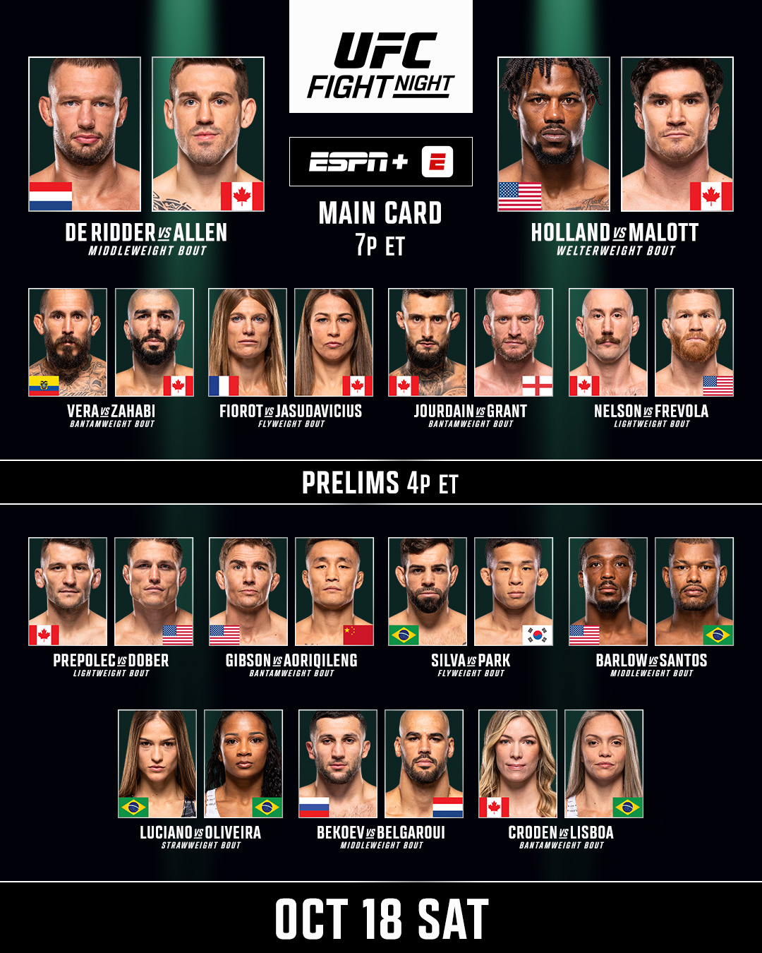 Reinier de Ridder vs. Brendan AllenKevin Holland vs. Mike MalottMarlon Vera vs. Aiemann ZahabiManon Fiorot vs. Jasmine JasudaviciusCharles Jourdain vs. Davey GrantKyle Nelson vs. Matt Frevola