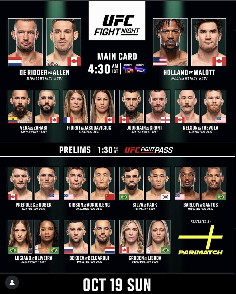 After playing host to the UFC’s first post-pandemic show north of the border, Vancouver lands its second event in a little over two years as UFC Fight Night: De Ridder vs Allen rolls into Rogers Arena this weekend.Headlined by a pivotal middleweight pairing and featuring a number of matchups between ranked and established competitors, Saturday’s fight card promises to be another thrilling event in a series of entertaining shows over the last several weeks. With seven of the 13 bouts featuring Canadian competitors, this promises to be another raucous evening in Van City.Main Event:>Reinier de Ridder vs Brendan AllenLocation: Rogers Arena — Vancouver, BCWhere to Watch: ESPN+Other Main Card Matches:>Kevin Holland vs Mike Malott>Marlon Vera vs Aiemann Zahabi>Manon Fiorot vs Jasmine Jasudavicius>Cody Gibson vs Aoriqileng>Kyle Nelson vs Matt FrevolaPrelim Matches:>Charles Jourdain vs Davey Grant>Bruno Silva vs HyunSung Park>Danny Barlow vs Djorden Santos>Kyle Prepolec vs Drew Dober>Stephanie Luciano vs Ravena Oliveira>Azamat Bekoev vs Yousri Belgaroui>Melissa Croden vs Tainara Lisboa