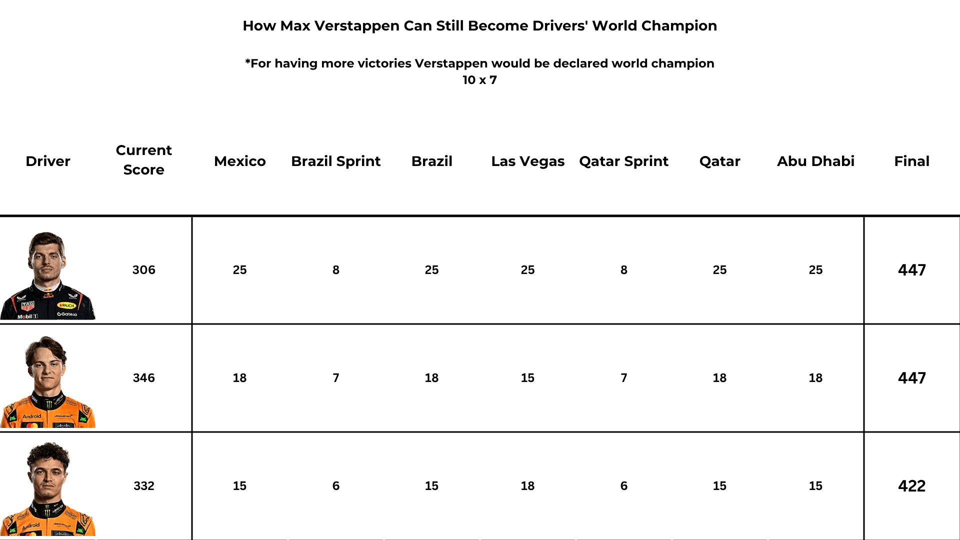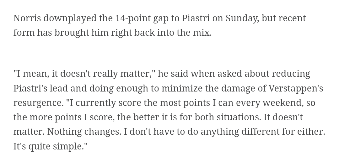 im too lazy to actually math it out but if verstappen wins every race after this but piastri or norris gets 2nd/3rd every race he still won't win WDC rightactually nevermind as i typed that i forgot about sprints, there's one in brazil and one in qatar, if he won those then maybe it's possible