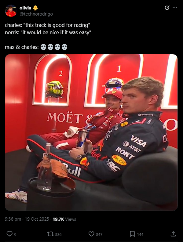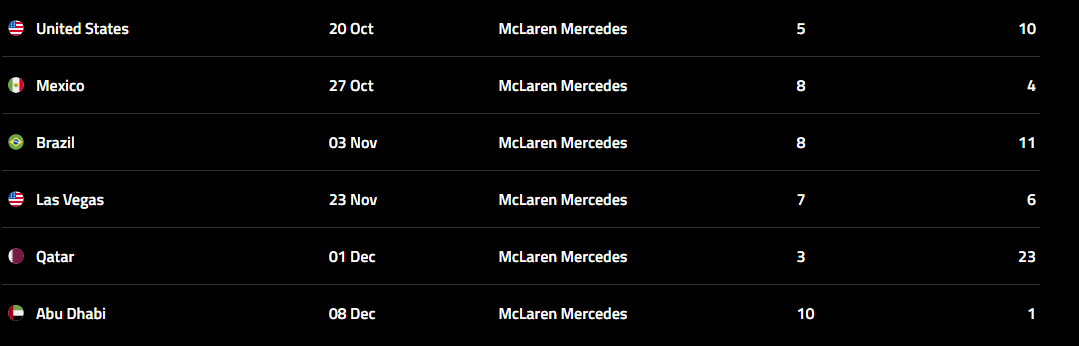 >Lap:#8170>Countdown to Mexico City GP:https://f1exposure.com>Previous thread:>>151477858>/f1/ Essentials:https://pastebin.com/tZ67Gcuq>new in the essentials: 24/7 stream of the F1 Reviews from 1990-2009 (and possibly more F1-related content in the future):https://angelthump.com/gimi>FantasyGP.com /f1/ League Formula Autism:Passcode: 12481641>Haas F1 Team F1 Grands Prix without ever scoring a podium:209>Fernando Alonso F1 Grands Prix since last win:220 (219 starts)>2025 WDC Standings:PIA: 346 (+10)NOR: 332 (+18)VER: 306 (+25)RUS: 252 (+8)LEC: 192 (+15)>2025 WCC Standings:McLaren Mercedes: 678 (+28)Mercedes: 341 (+8)Ferrari: 334 (+27)Red Bull RBPT: 331 (+31)Williams Mercedes: 111 (+0)>2025 WEC StandingsNOR: 1092.24 (+69.89)HAM: 1073.33 (+68.75)TSU: 1023.08 (+78.98)>News:F1 US GP: Max Verstappen takes dominant victory from Lando Norris, Oscar Piastri fifth'We will try whatever we can' - Verstappen'Good battle with Leclerc' - Norris'I knew it was a bit of a risky move' - LeclercLeclerc is DOTDVery important poll: https://strawpoll.com/polls/kjn1DEBQJyQ