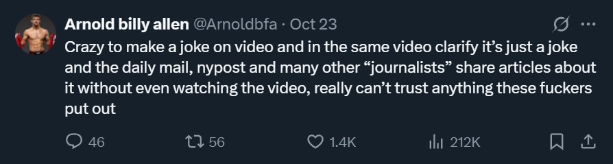 >>151564618Apparently it was all a jest https://nitter.privacyredirect.com/Arnoldbfa/status/1981338410116681847#m