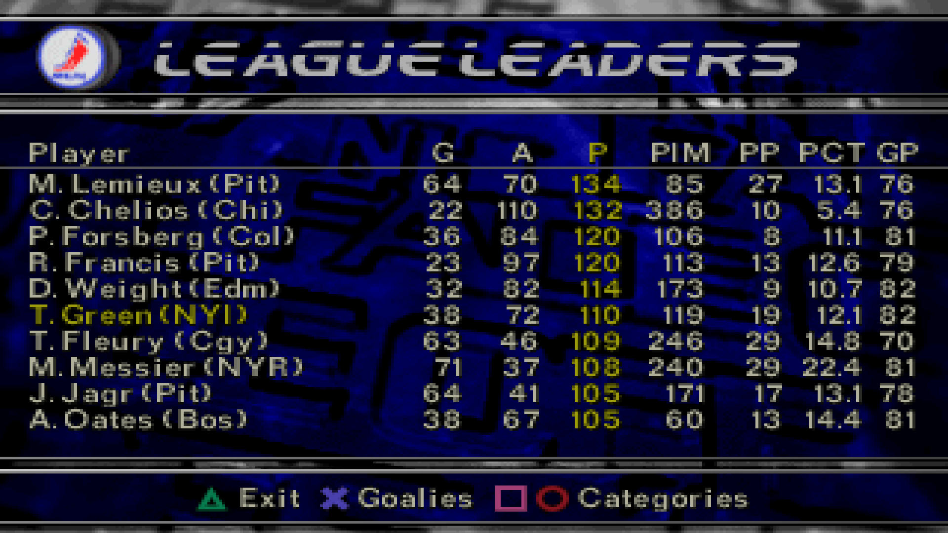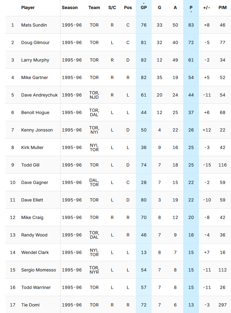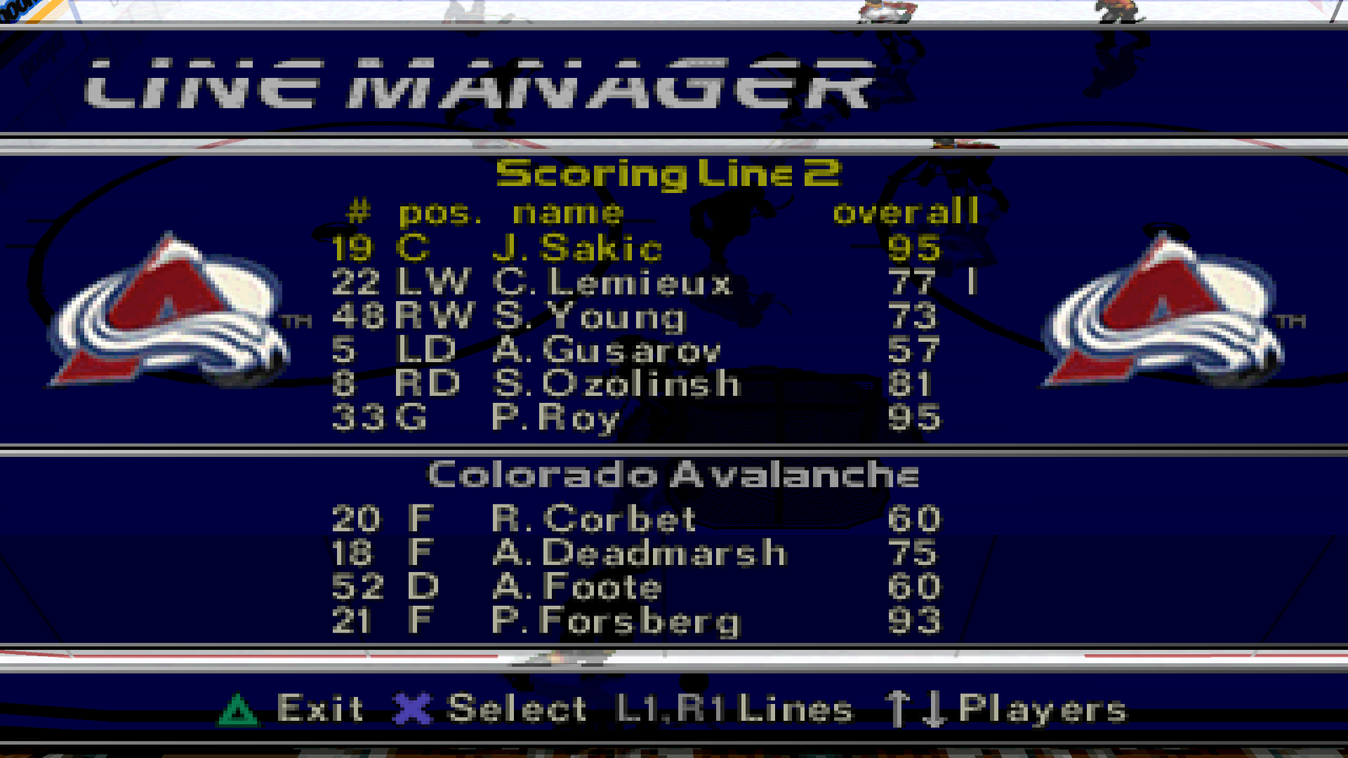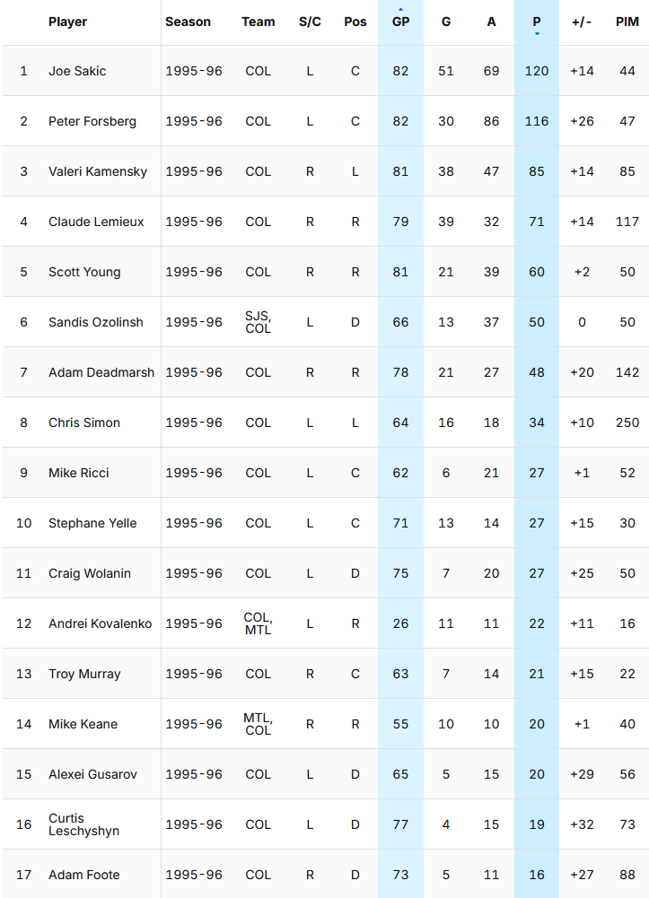 >>151580795Forsberg 93, Roy 95, Kamensky 83, Ozolinsh 81