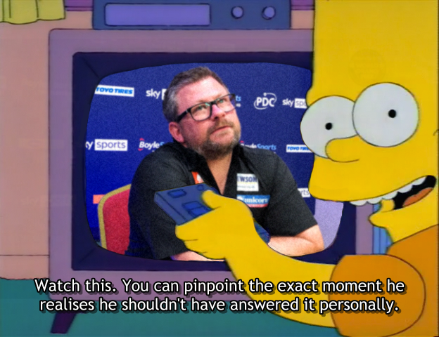 >>151596149Shame, that would have been funny.Your bracket for tomorrow:>Noppert v Pietreczko>Humphries v Wade>Joyce v van Veen>van Gerwen v Gurney>>151596703Definitely. I think having that disaster at the Matchplay helped as well because he fucking embarrassed himself. He's finally realised acting like a tit did him no favours.
