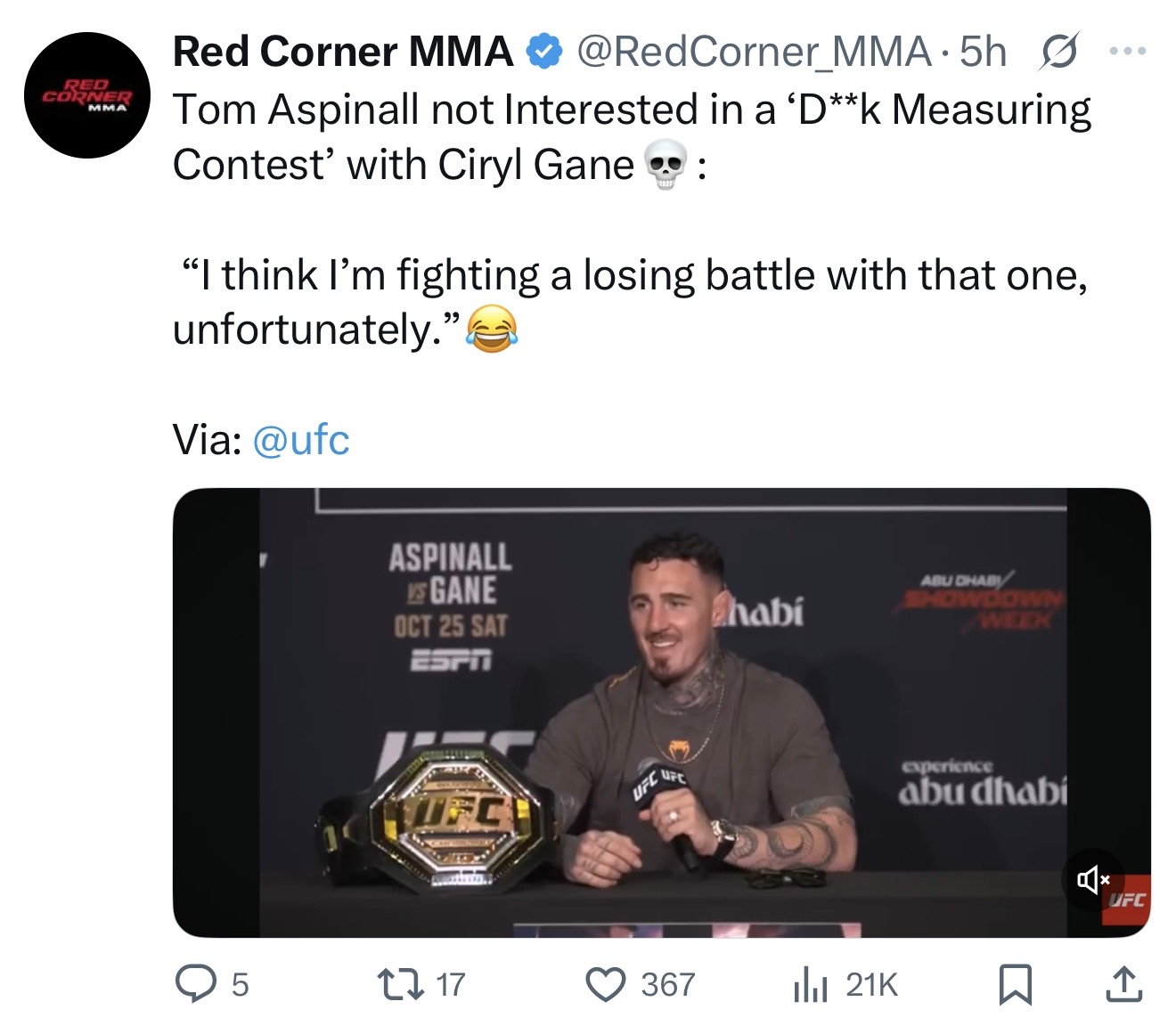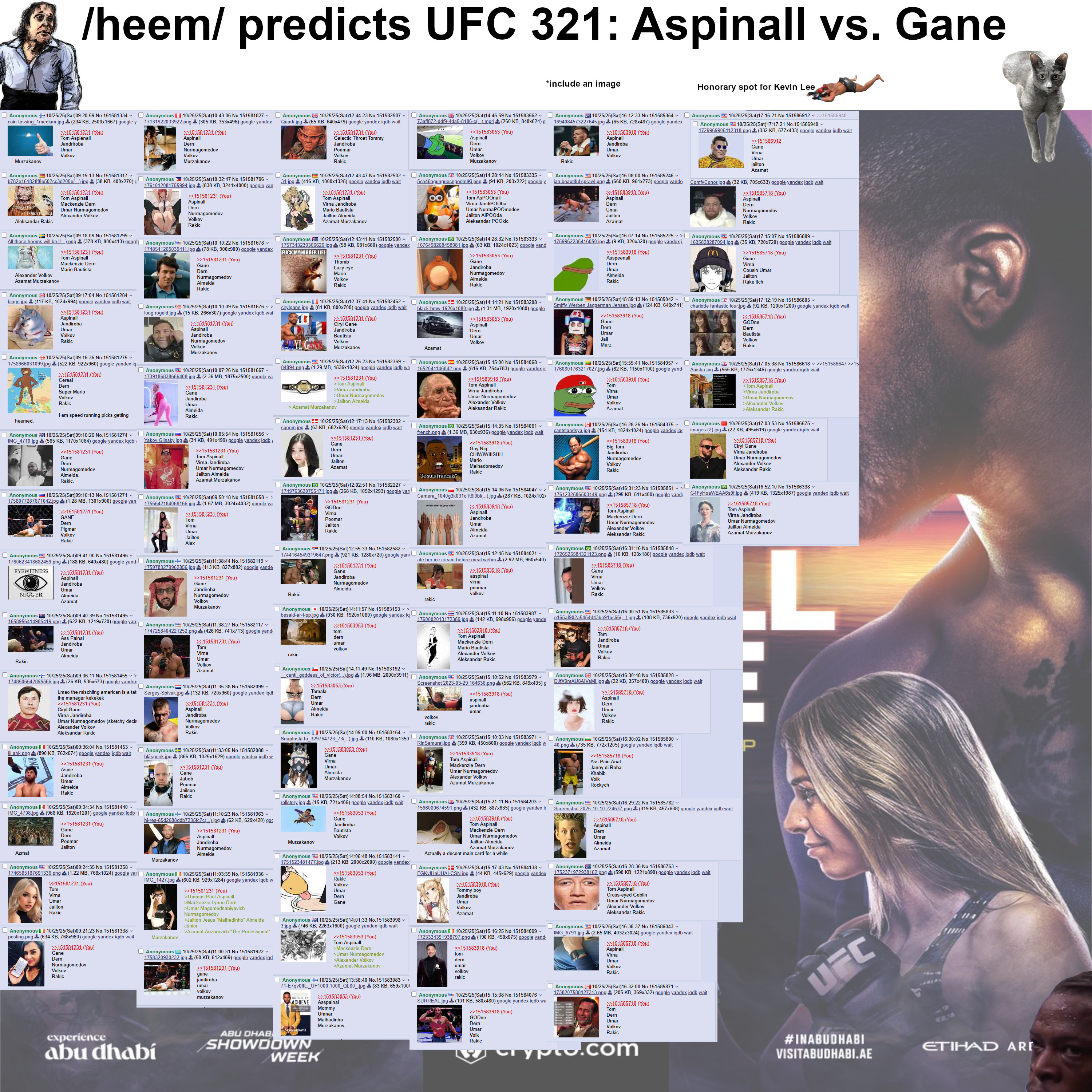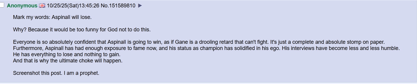 Mark my words: Aspinall will lose.Why? Because it would be too funny for God not to do this.Everyone is so absolutely confident that Aspinall is going to win, as if Gane is a drooling retard that can't fight. It's just a complete and absolute stomp on paper. Furthermore, Aspinall has had enough exposure to fame now, and his status as champion has solidified in his ego. His interviews have become less and less humble. He has everything to lose and nothing to gain.And that is why the ultimate choke will happen. Screenshot this post. I am a prophet.