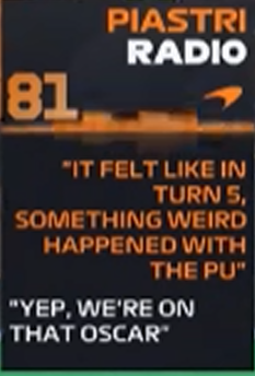 piastri's engine was giving power to lando through 5g. it's ok because toto will remotely blow up lando's engine as agreed on his yacht